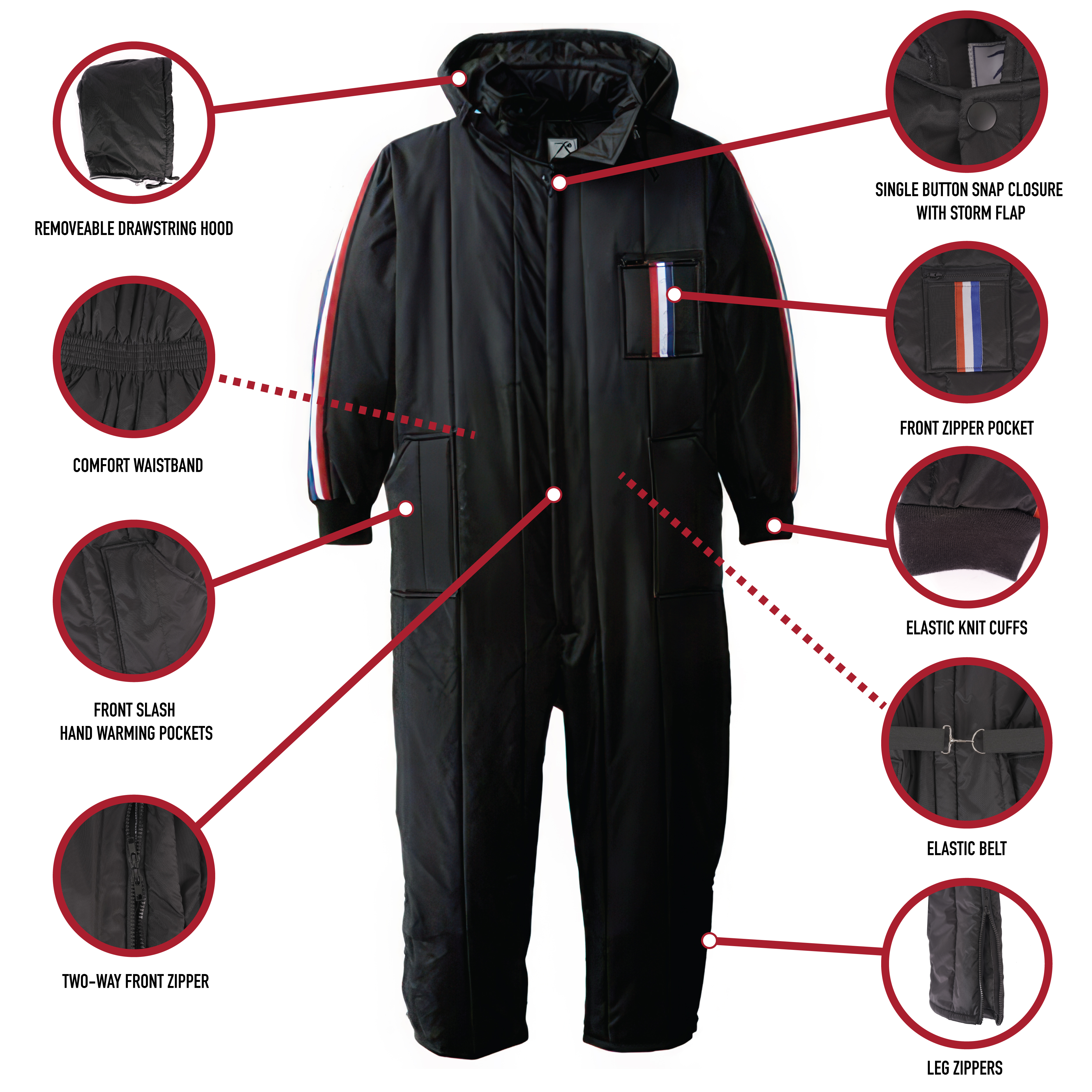 Overcome extreme winter weather with our Ski and Rescue Suit. Designed to keep you warm and dry in extreme elements, these insulated snowsuits are perfect for skiing, snowmobiling, hunting, outdoor work, or any activity requiring you to spend long periods of time in cold weather. Coldproof Insulation: These one-piece winter jumpsuits are lined with Hollofil 808 insulation that contains a hollow core, trapping air inside for greater warmth and loft. These waterproof snowsuits also consist of a heavy oxford nylon shell that blocks the wind, rain, and snow. Ultimate Heat Retention: Regulate your body temperature with the detachable zip-off hood and insulated collar. The drawstring hood utilizes a back zipper, allowing you to remove or reattach it as the need arises. These ski suits contain 2 lined side slash pockets for keeping your hands warm and dry. Comfortable Design: These one-piece ski suits feature a two-way front zipper that provides you with easy access from top and bottom. The front zipper also features a single snap closure for better insulation. In addition, the leg zippers allow you to put on or take off your boots with ease. These snowsuits also have a front zipper pocket for securing small items and accessories. Utility at the Forefront: The black elastic knit cuffs and belt helps retain heat by keeping the cold weather ski suit close to your body. The elastic belt is designed to have a snug and secure fit. The waterproof ski suit also features red, white, and blue stripes that run down each arm and left chest pocket.