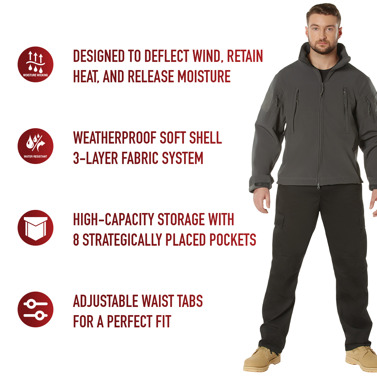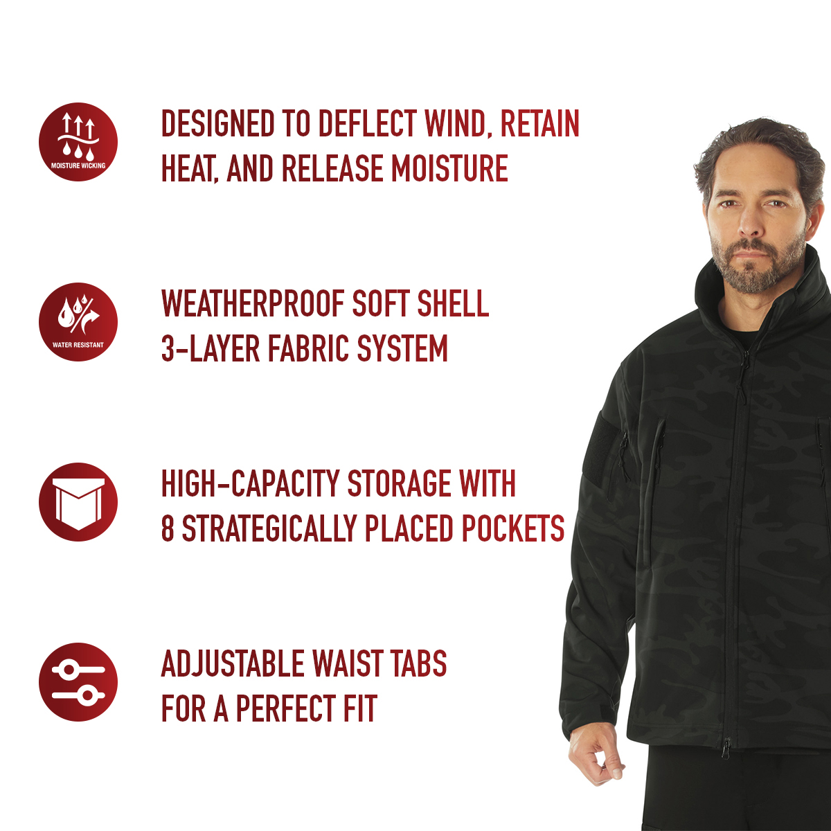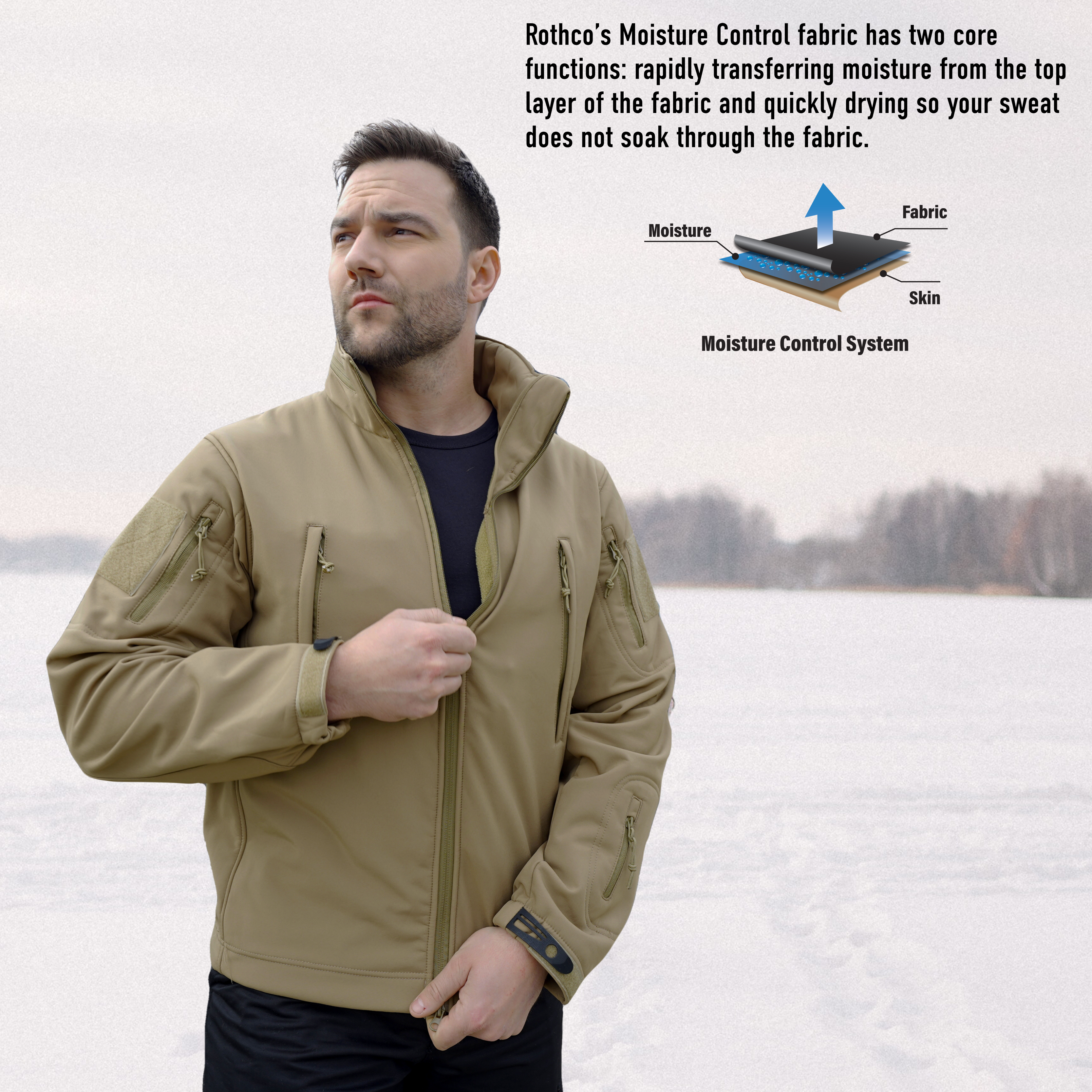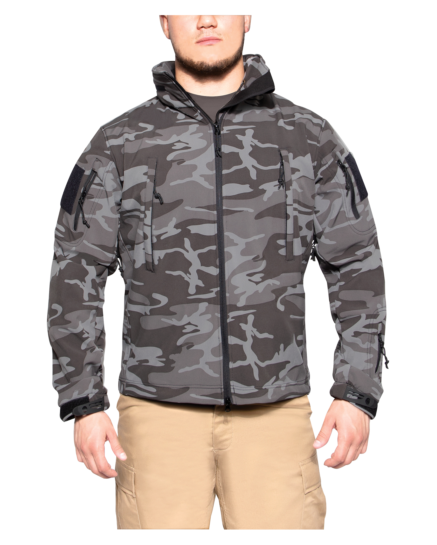Defend yourself against the toughest weather with the Special Ops Soft Shell Jacket. As part of Rothco’s rugged Soft Shell outerwear series, the tactical military jacket features our Soft Shell waterproof 3-layer fabric system that deflects wind, retains heat, and releases moisture. The high-performance fabric helps protect and keep you comfortable while braving the elements. This versatile coat is great for military personnel, tactical professionals, and outdoor enthusiasts. Comfortable Fleece Lining: The insulated jacket features a soft fleece lining that keeps you warm, ideal for cold weather tactical operations and outdoor adventures. The fleece-lined collar features a removable stowaway hood and provides additional protection. High-Capacity Storage: The military soft shell jacket comes equipped with 8 tactical zipper pockets: 2 shoulder pockets, 2 chest pockets, 2 internal pockets, 1 back pocket, and 1 arm pocket for storing tactical gear and outdoor essentials. Utility at the Forefront: The tactical soft shell jacket features underarm ventilation zippers that ensure optimal comfort by allowing air circulation. The drawstring waist and adjustable elastic wrist cuffs provide a perfect fit, while the two-way zipper offers quick and easy access. In addition, the 2 shoulder loop fields allow you to easily wear patches. Action Ready: From the field to the forest, the military-styled soft shell coat offers exceptional utility and warmth that is great for tactical missions, camping, hiking, hunting, fishing, and casual everyday wear.