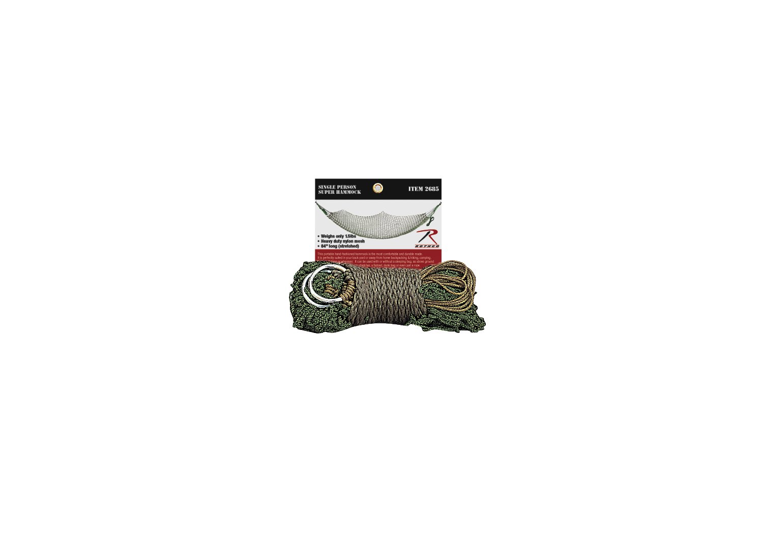 Unwind and enjoy the outdoors with Rothco’s Super Hammock, a robust and spacious hammock designed for ultimate relaxation. Crafted from durable nylon rope, this hammock is built to last, capable of supporting up to an impressive 881 pounds. Measuring 20 feet in length and 5 feet in width, it offers ample space for you to sit or lie down comfortably. Whether you're at a campsite, in your backyard, or on a hiking adventure, this outdoor hammock provides a reliable and comfortable spot to relax. Its lightweight design allows it to be easily folded and stored in a bag or pack, making it a perfect companion for travel. Whether you're an avid camper, hiker, or someone who simply enjoys lounging outdoors, our Super Hammock is an essential addition to your gear. Gift it to the outdoor enthusiast in your life, or treat yourself to the ultimate relaxation experience.