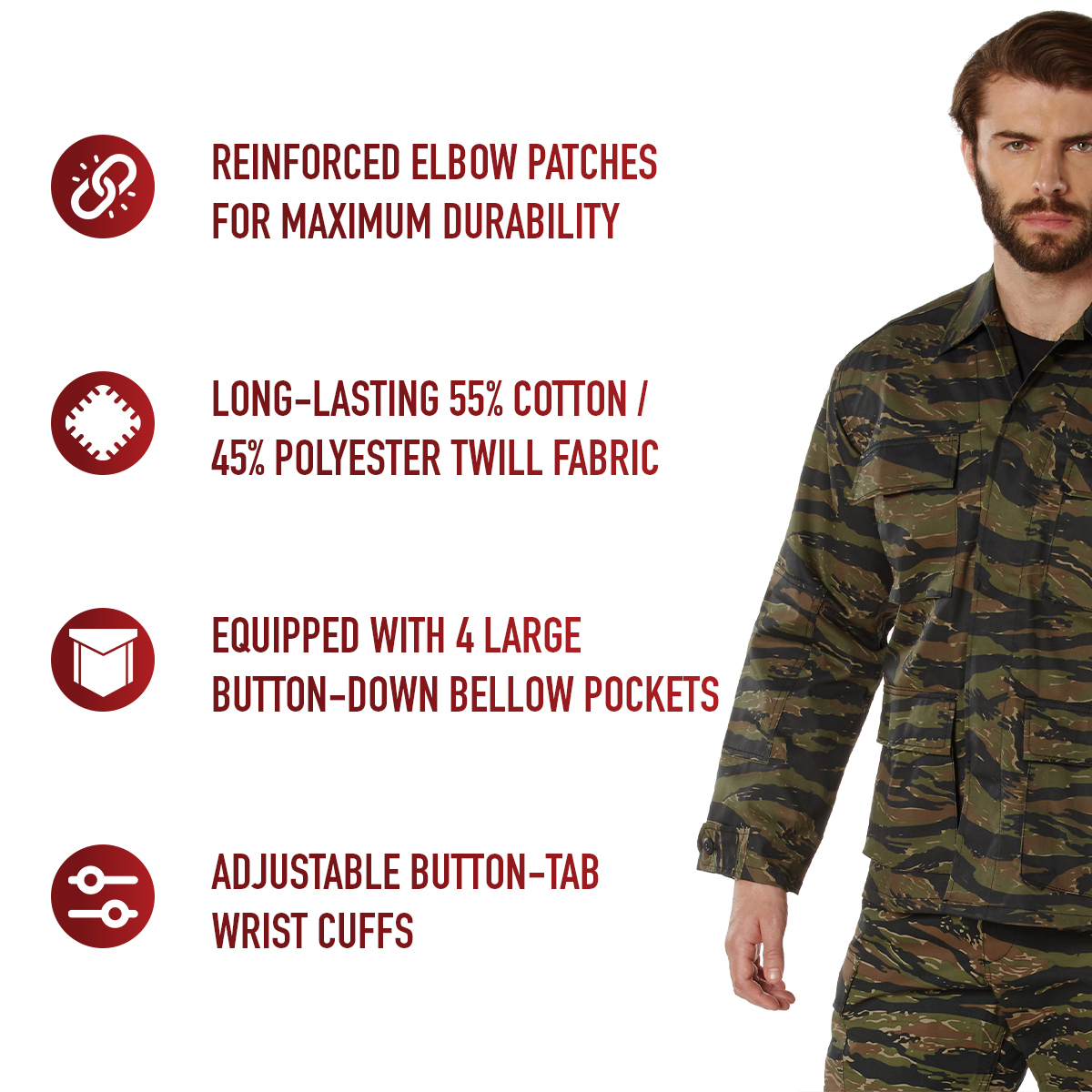 Inspired from the functionality and practicality of American military attire, our Twill BDU Shirts are designed to tackle the roughest outdoor elements while providing comfortable all-day wear and adaptability. These button-down shirts are the real deal and can handle whatever you throw at them. Tried-and-True Reliability: These tactical shirts feature reinforced elbow patches for maximum durability that endures wear and tear while protecting your arms. The double-stitched seams provide extra strength and years of reliable use, while the front button-flap closure shields you from outdoor debris. High-Capacity Utility Pockets: The long sleeve shirt comes equipped with four large button-down bellow pockets that expand when being used and stay flat when not. These front utility pockets are perfect for holding everyday essentials like your phone, wallet, keys, or multi-tool. Unparalleled Durability: Each military shirt is crafted with a long-lasting 55% cotton / 45% polyester twill fabric. This blend provides unmatched resiliency and easy-to-care-for maintenance (machine washable). These shirt jackets aren’t afraid to get down and dirty out in the wilderness. Supreme Comfort & Fit: The adjustable button-tab wrist cuffs allow you to adjust your sleeves as needed. These combat uniform shirts also incorporate button-tabs on the waist for a perfect fit. They can be worn as a shirt or jacket, making for a great shacket. A Full Set: Complete your uniform with a matching pair of our Tactical BDU Cargo Pants or Relaxed Fit Zipper Fly BDU Pants.