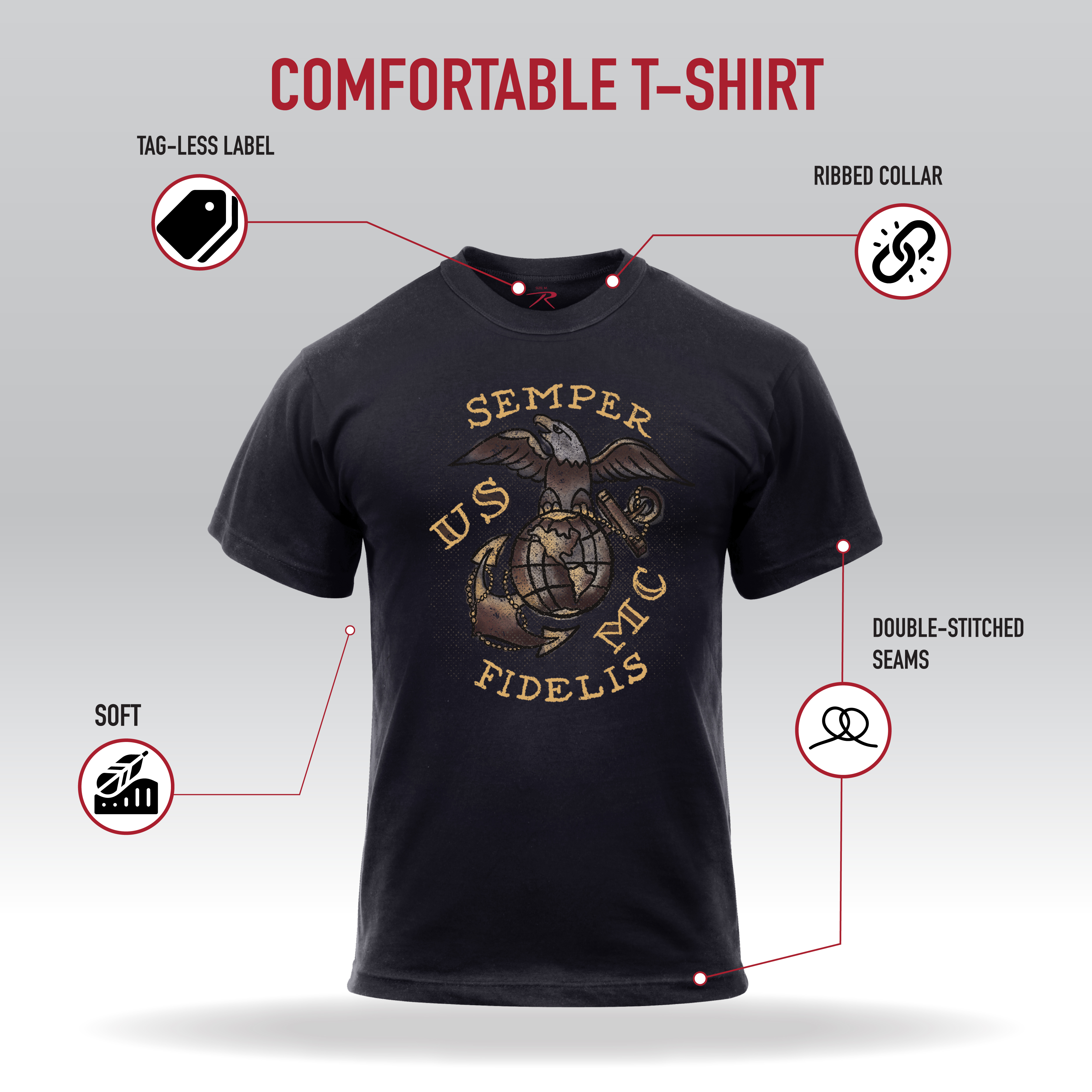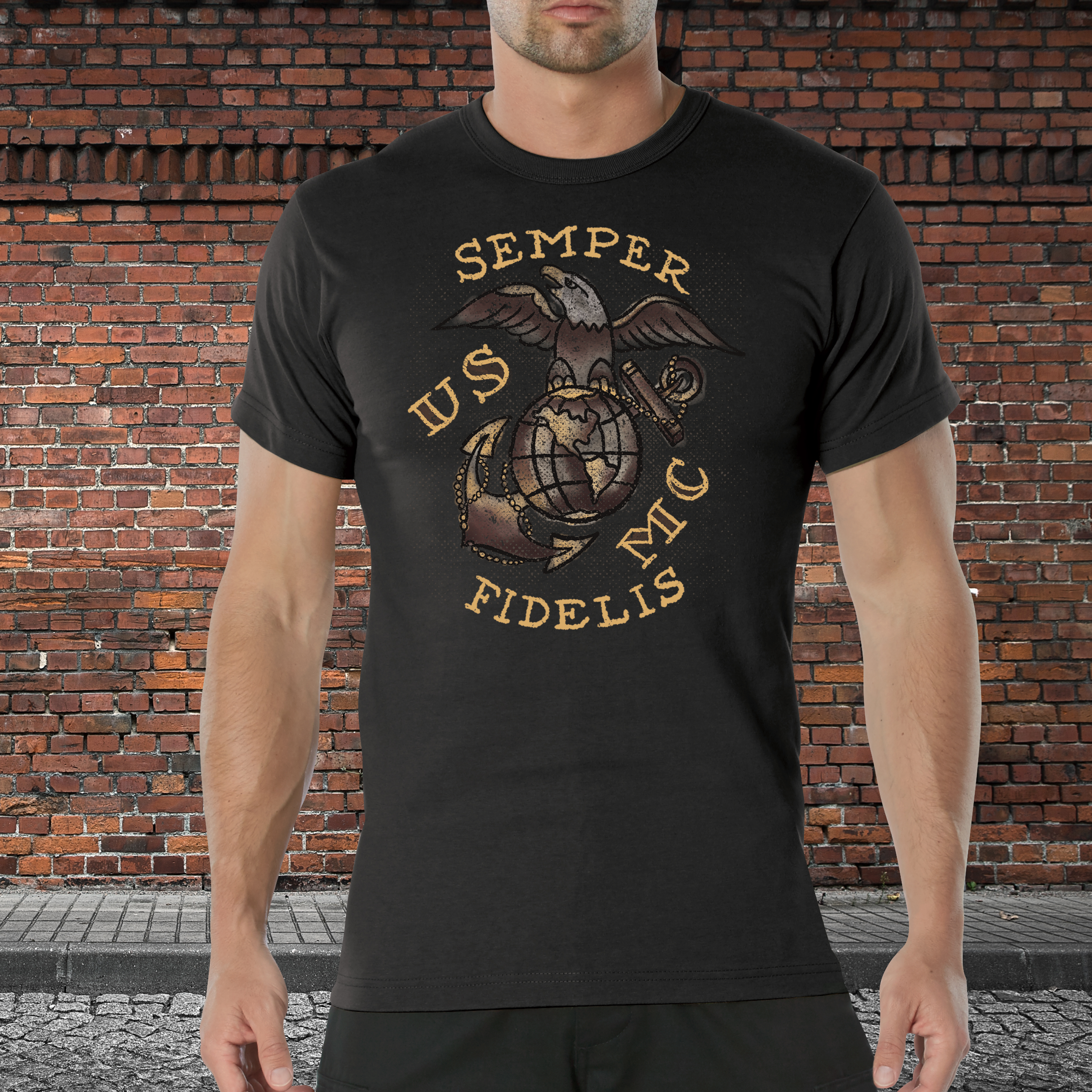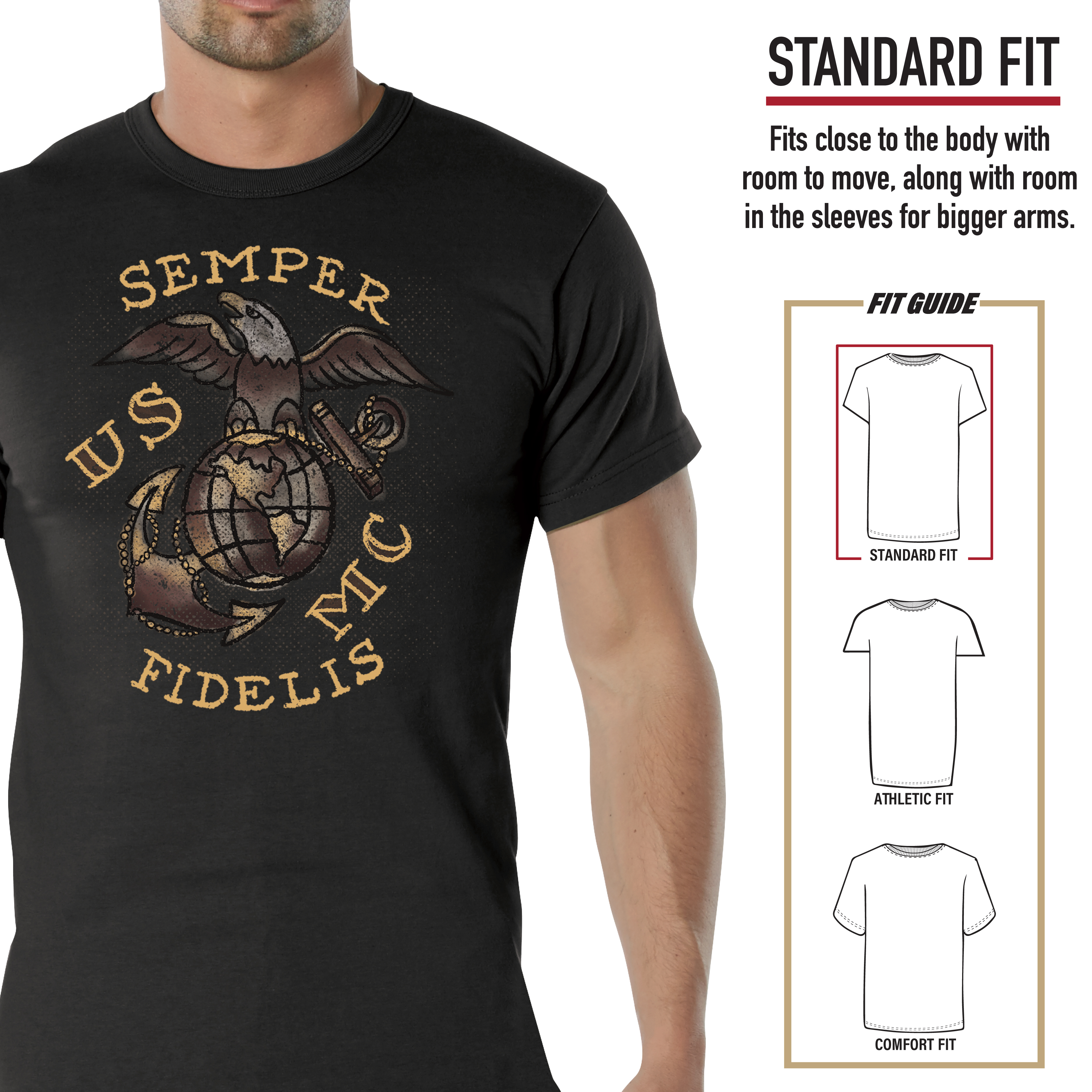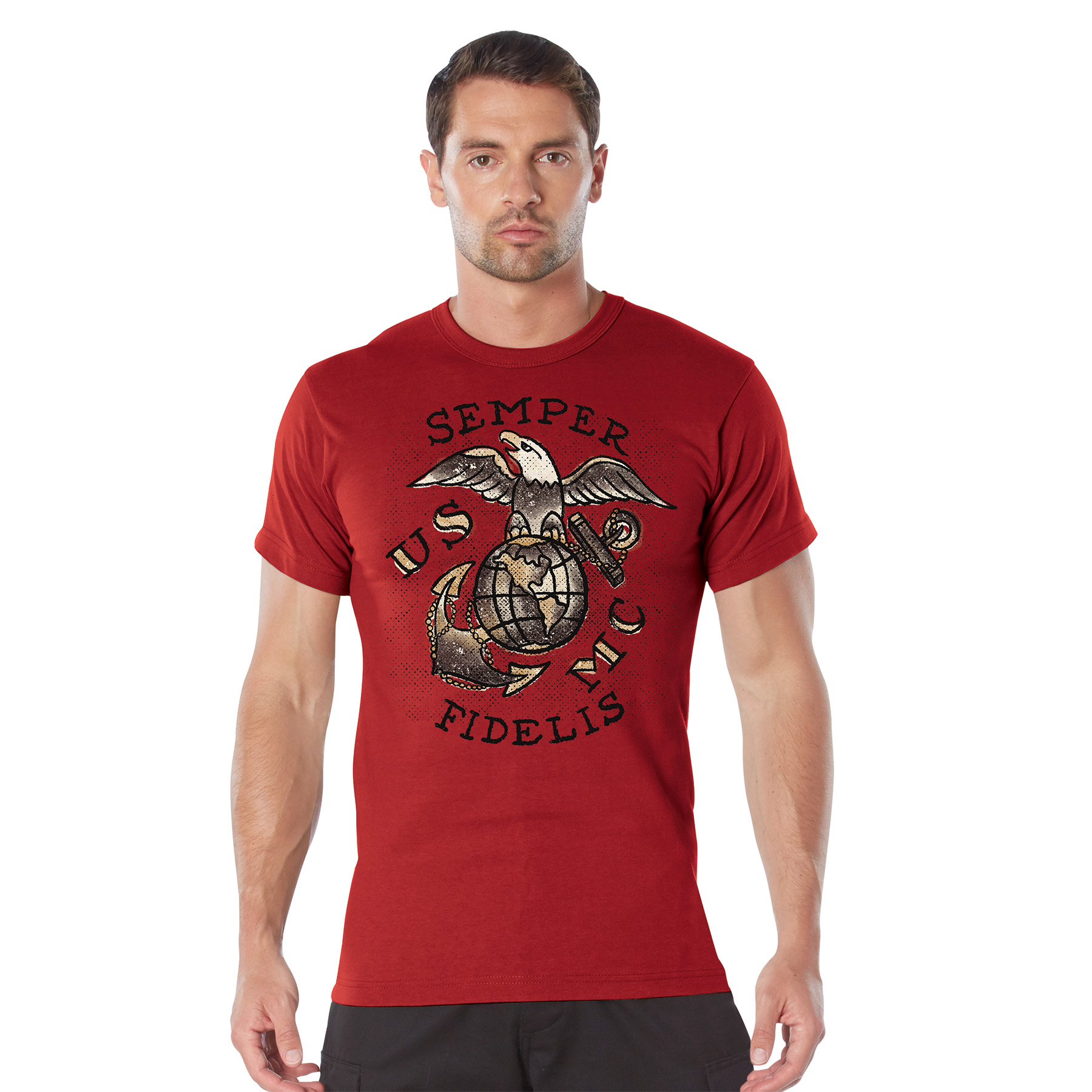 Show your support for the United States Marine Corps with our USMC Semper Fidelis T-Shirt! This rugged military tee features American traditional style lettering and the Eagle, Globe, and Anchor insignia. This short sleeve t-shirt is officially licensed by the United States Marine Corps. Reliable and Long-Lasting: The breathable cotton fabric easily withstands strenuous activities while remaining soft and comfortable. For added durability, these graphic t-shirts feature a ribbed collar, tag-less neck label, and reinforced seams at the sleeves and bottom hem. Standard Fit: The Semper Fi t-shirt is designed with a standard fit, giving you room and flexibility for any activity. The crew neck shirt sits approximately at the waist for full coverage and comfort. Show Your American Spirit: This shirt is an officially licensed product of the United States Marine Corps. In addition to being a great base layer for outdoor exercise routines, a day at the range, or daily use, these tees are perfect for military personnel, veterans, and more. We’ve Got You Covered: Pair your patriotic tee with one of our Tactical BDU Cargo Pants or Vintage Paratrooper Cargo Shorts.