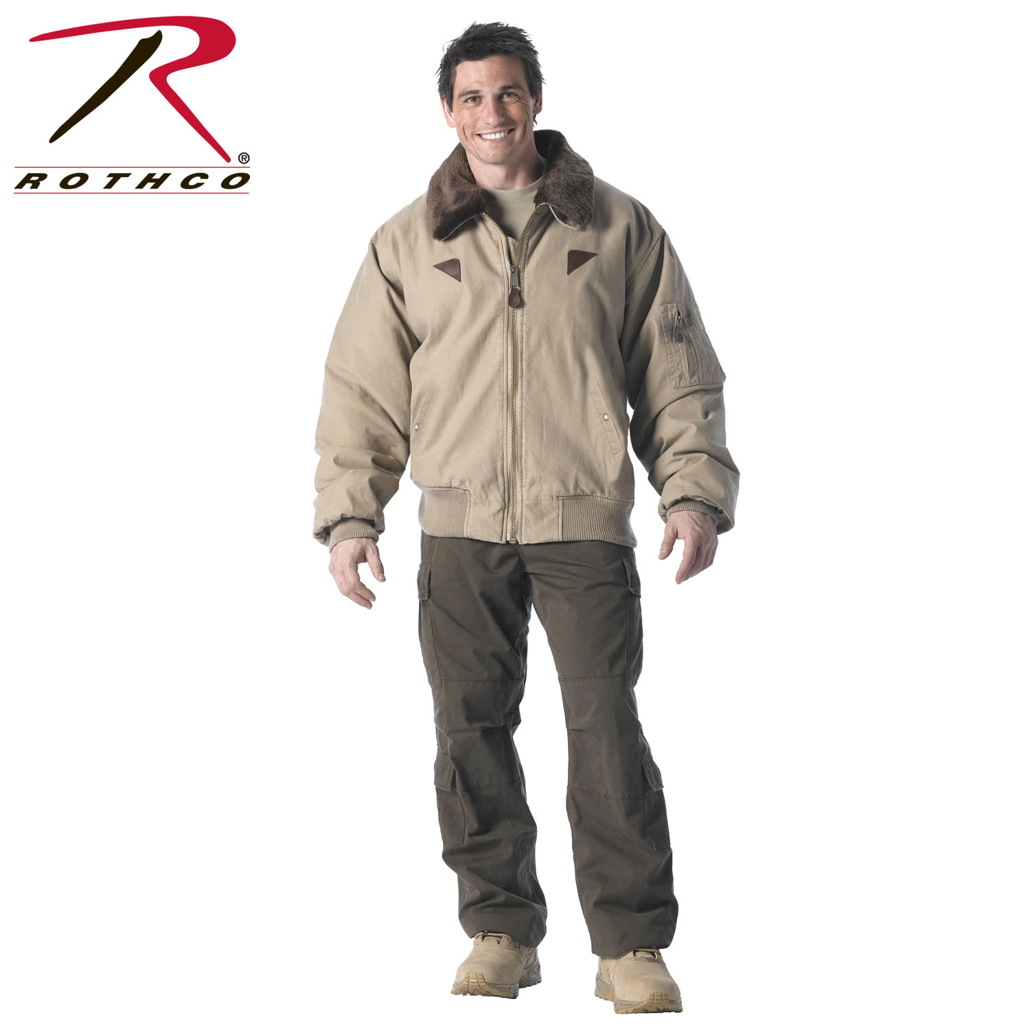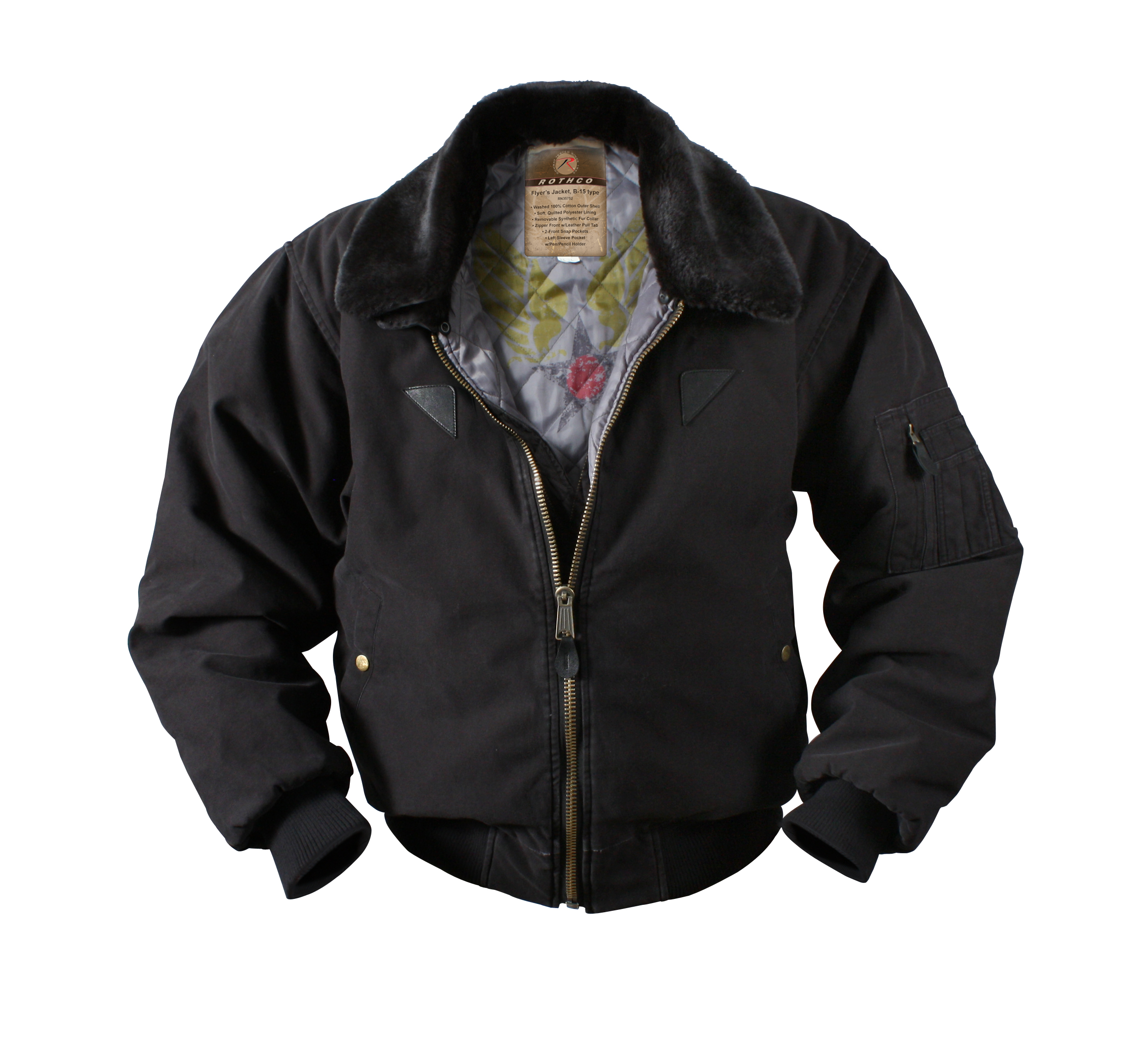 Rothco's Vintage B-15A Bomber Jacket pays homage to the iconic American flight jacket with its authentic design. The warm quilted lining features a vintage inspired Air Command print, while the removable fur collar adds extra warmth and comfort. Ribbed knit waist and cuff accents provide flexibility, and the military jacket boasts ample storage with 2 front pockets with snap closures and a sleeve zippered pocket. Small leather accents on the chest enhance the jacket's authenticity, and the bi-swing back ensures comfort and a greater range of motion. Made from durable heavyweight cotton, this military style jacket is ideal for spring, fall, and mild winters, offering timeless style and functionality.