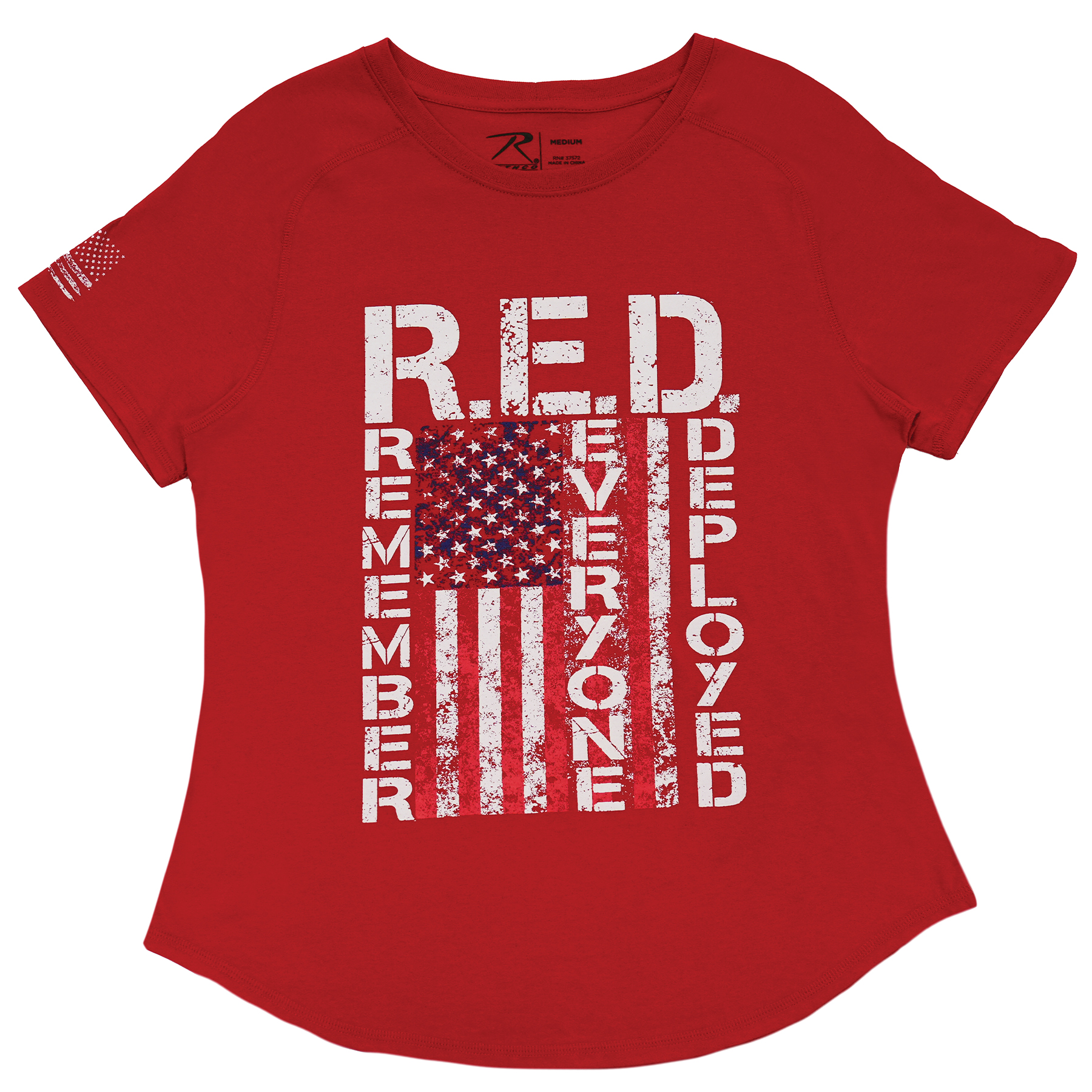Show your solidarity and support for all military personnel serving with our Womens R.E.D. (Remember Everyone Deployed) T-Shirt. This patriotic shirt features a graphic design on the front that honors deployed service members, along with a distressed American Flag on the right sleeve. Unbelievable Comfort: Made from a special Cotton/Polyester blend, the women’s R.E.D. shirt is silky-smooth and soft to the touch. For added comfort, these graphic tees feature flat seams at the collar, sleeves, and bottom hem, as well as a tag-less label. Comfortable and Easygoing: Designed with a flattering fit and curved hem, this crewneck t-shirt sits just right while complementing your body. These comfy t-shirts feature a raglan sleeve style as well. Land of the Free: Whether you’re out hiking on a trail, spending a day at the beach, or casually walking around town, our Remember Everyone Deployed T-Shirts are great for weekend adventures, working-out, everyday use, and more. They’re also perfect for showcasing your American spirit during 4th of July, Memorial Day, and Veterans Day. Complete the Look: Our R.E.D. (Remember Everyone Deployed) T-Shirt goes especially well with a pair of our Womens Vintage Paratrooper Fatigue Pants or BDU Cargo Pants.
