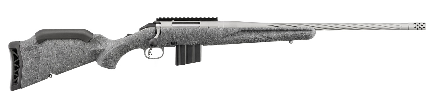 Caliber: 6.5 Grendel - StockGray Splatter Gen II American - Barrel Fluting Spiral - Barrel Length 20 - Barrel Finish Gun Metal Gray Cerakote - Thread Pattern 5/8-24 - Capacity 10 - Magazine Type AR-Style - Sights None-Picatinny Scope Base - Material Alloy Steel - Weight 6.5 lb. - Twist 1:8 RH - Overall Length 41.25 - Length of Pull 12-13.75 - Grooves 5 - Splatter finished stock provides excellent grip without being too sharp or abrasive. - Soft rubber recoil pad features a large radius on the heel for easy shouldering and improved geometry that progressively collapses to reduce felt recoil. - Removing the installed spacer allows for length of pull to be adjusted from 13.75 to 12. - Installed low comb improves sight alignment when using magnified optics but can be removed when utilizing low-mounted sights. More comb options are available at ShopRuger.com to further refine the fit. - Professionally applied Cerakote coating on barrel muzzle brake receiver and bolt handle results in a durable easy-to-maintain finish. - Medium contour barrel features deep spiral flutes that reduce weight at the muzzle end of the barrel to improve balance without sacrificing stiffness or accuracy. - Threaded barrel with factory-installed radial port muzzle brake is cold hammer-forged resulting in ultra-precise rifling that provides exceptional accuracy and longevity. - Intuitive three-position tang safety locks the bolt preventing inadvertent bolt opening while allowing the rifle to be loaded with the safety engaged. - Ruger Marksman Adjustable trigger offers a crisp release with a pull weight that is user-adjustable between 3 and 5 pounds. - Patented Power Bedding integral bedding block system positively locates the receiver and free-floats the barrel for outstanding accuracy. - The one-piece bolt is CNC machined from stainless steel for smooth operation and the familiar three-lug design with 70� throw provides ample scope clearance. - Oversized bolt handle for positive bolt manipulation with a 5/16-24 thread pattern for easy replacement. - Factory-installed one-piece Picatinny scope base. - Available accessory stock weight kit adds up to 1.6 pounds to the butt of the rifle to absorb recoil and improve the rifle's balance when utilizing heavier muzzle devices. - Also includes: one magazine; steel sling swivel studs.
