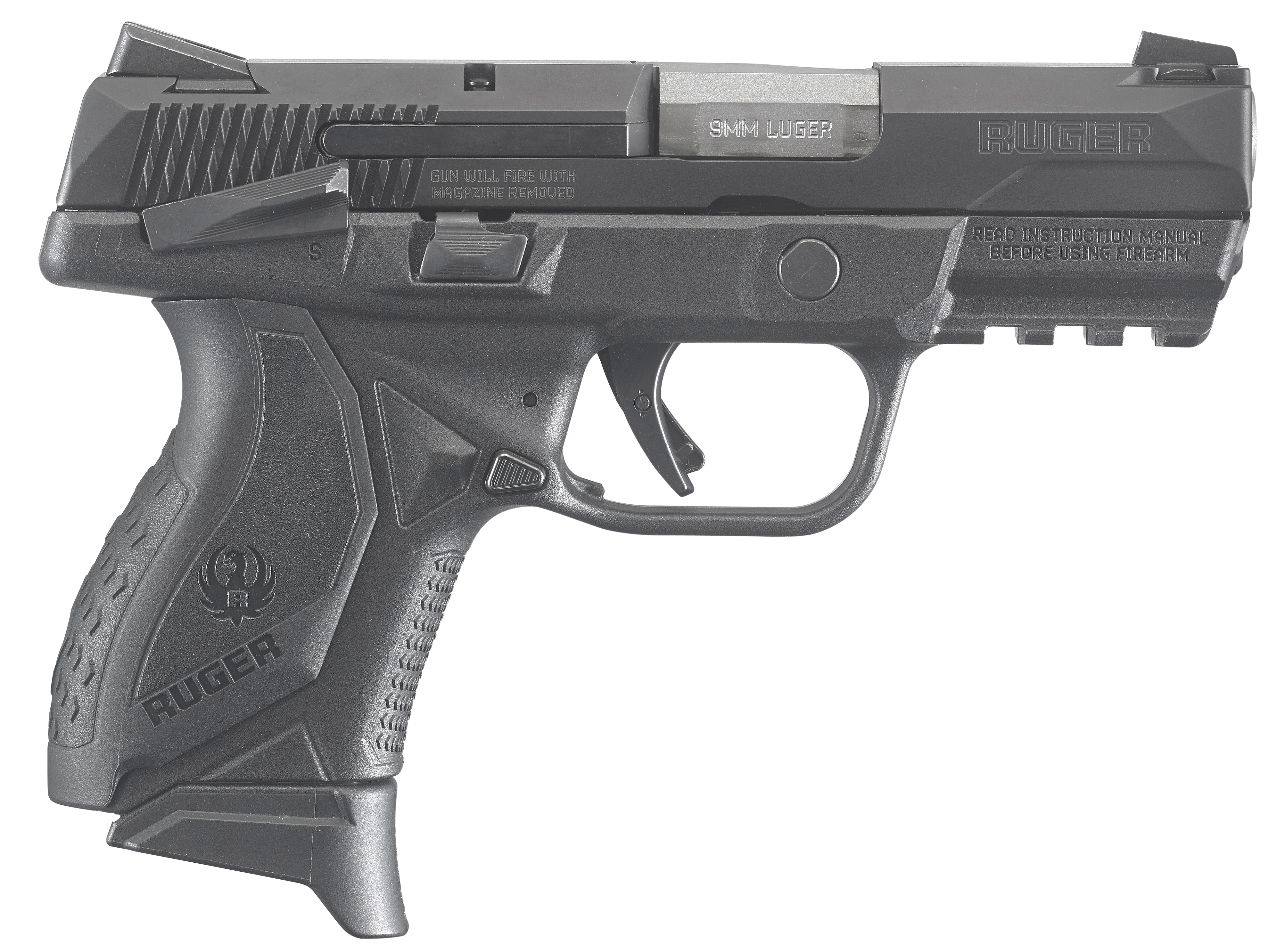 The Ruger American Pistol has a recoil-reducing barrel cam low-mass slide low center of gravity and low bore axis. The pre-tensioned striker system features a powerful striker spring for positive ignition without a heavier trigger pull. Its non-slip surfaces include functional slide serrations and grip/frame texturing for enhanced control. The American Pistol features a modular wraparound grip for adjusting palm swell and trigger reach to fit a wide range of hand sizes. Ergonomic grip modules lock in solidly and do not loosen. It has an ambidextrous slide stop and magazine release Novak LoMount carry three-dot sights MIL-STD-1913 Picatinny rail. Safety features include internal automatic sear block system ambidextrous manual safety and integrated trigger safety. Includes two nickel-Teflon plated steel magazines (one 12rd and one 17rd with grip extension); small medium and large grip modules.