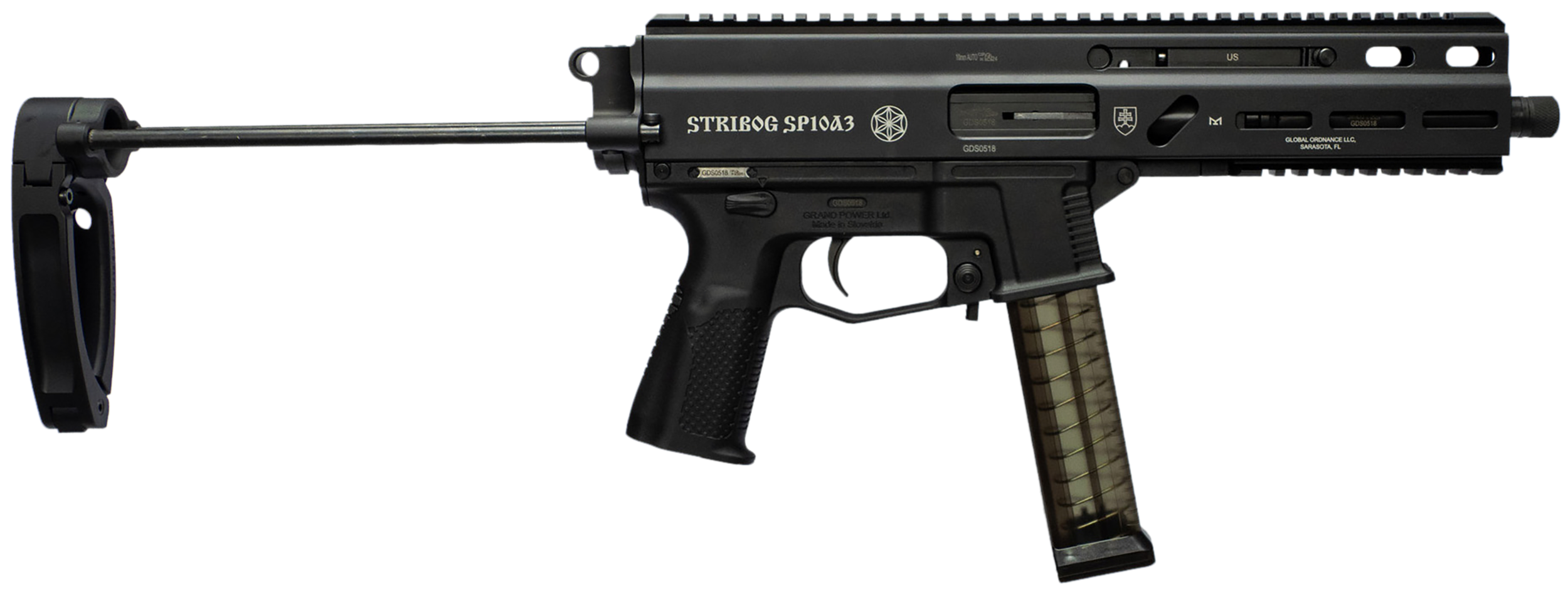 Grand Power Stribog 10mm Auto, roller delayed blowback; MIL-Spec trigger; Glock magazine compatible; thread protector; iron sights; ambidextrous safety lever and PDW Tailhook brace. Includes three magazines.