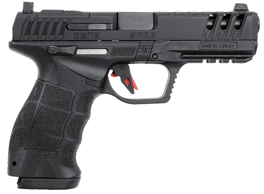 Possibly the most rigorously tested pistol ever developed the new SAR9 GEN3 endured 150000 rounds of live fire at the factory. The polymer framed striker fired SAR9 GEN3 points naturally and is a pleasure to shoot. With a choice of three interchangeable back straps to customize fit and 20 degree grip angle providing superior control. - Available in a number of different configurations including some models having mounting screw holes for direct installation of a micro reflex sight. - Features - Polymer Frame - Forged Steel Barrel & Slide - Interchangeable Grip Panels - Manual Safety - Striker Status Indicator - Picatinny Accessory Rail