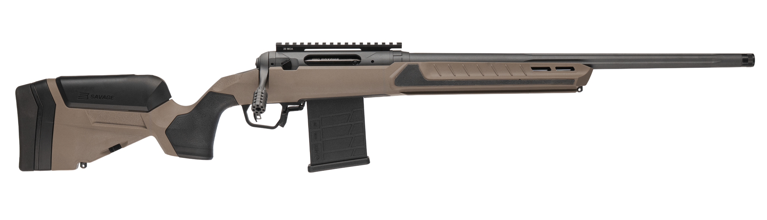 Meet the ultimate tactical range rifle engineered to perform from the first zero to the last match: a rugged, precision-ready platform in Coyote Tan with length-of-pull and comb adjustments for a perfect, repeatable cheek weld. The beavertail forend pairs M-Lok panels and an integral ARCA rail with a one-piece 20 MOA top rail, giving you modularity and rock-solid optic alignment. Interchangeable grip modules and a tactical bolt knob let you tailor handling to your setup. Underneath, a Platinum Cerakoted barreled action, a black jeweled bolt body with threaded handle, a user-adjustable AccuTrigger, and medium-contour straight-fluted carbon steel barrel deliver smooth, consistent shots - threaded for suppressors or muzzle devices and compatible with AICS magazines. Built for serious shooters, it's available in all calibers, with left-hand options, too, so whether you're dialing in groups or running speed drills, this rifle adapts to you.