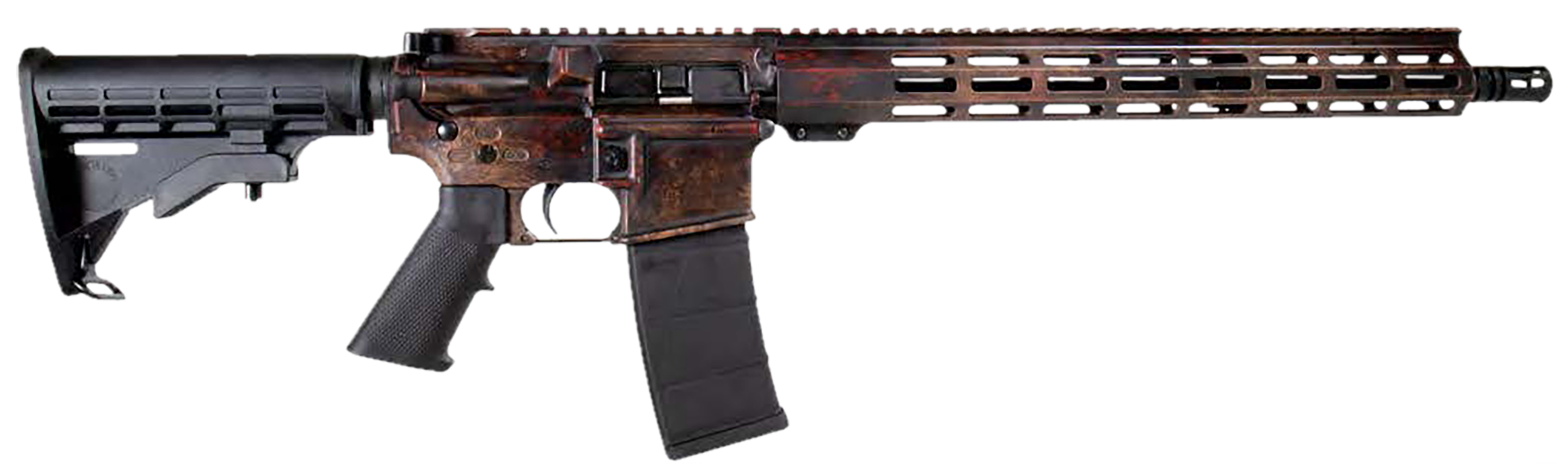 Rust AR is where battle-worn aesthetics meet cutting-edge durability. Featuring a red and brown Cerakote finish designed to mimic the rugged look of aged, weathered metal, this rifle brings an industrial, war-torn vibe to the range. The distressed rust effect on the receivers and handguard gives it a one-of-a-kind, battle-hardened appearance without sacrificing the corrosion resistance and durability that Cerakote provides. Built to perform and styled to stand out, the Rust AR is a true statement piece for shooters who appreciate both function and fierce design.