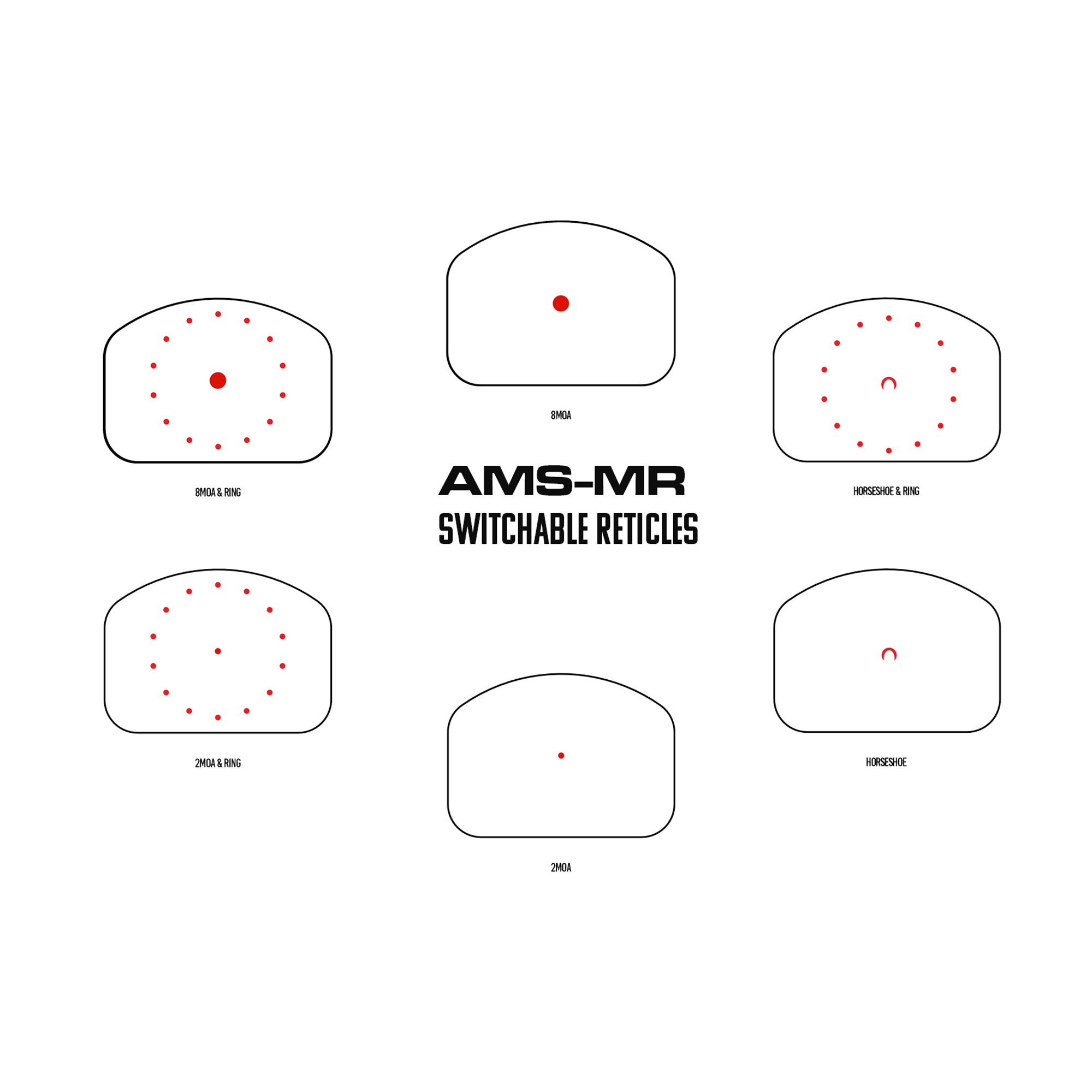 - Multi-Reticle Version allows for 2MOA, 2MOA + 65MOA Ring, 8MOA, 8MOA+ 65MOA Ring, 8MOA Horseshoe and 8MOA Horseshoe and Ring