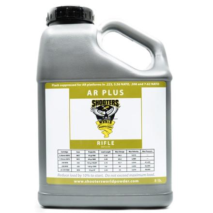 Shooters World AR Plus Smokeless Powder 1 Lb canisters. AR Plus provides additional cleanliness and flash suppression for AR platforms chambered in popular bottlenecked cartridges. As with our other spherical propellants AR-Plus flows like water through a volumetric charger. Loaders will see no more than 1/10th of a grain of variation in charge weight from a powder drop. This has been tested in Dillon RCBS Lee Hornady Hollywood and Lyman chargers.