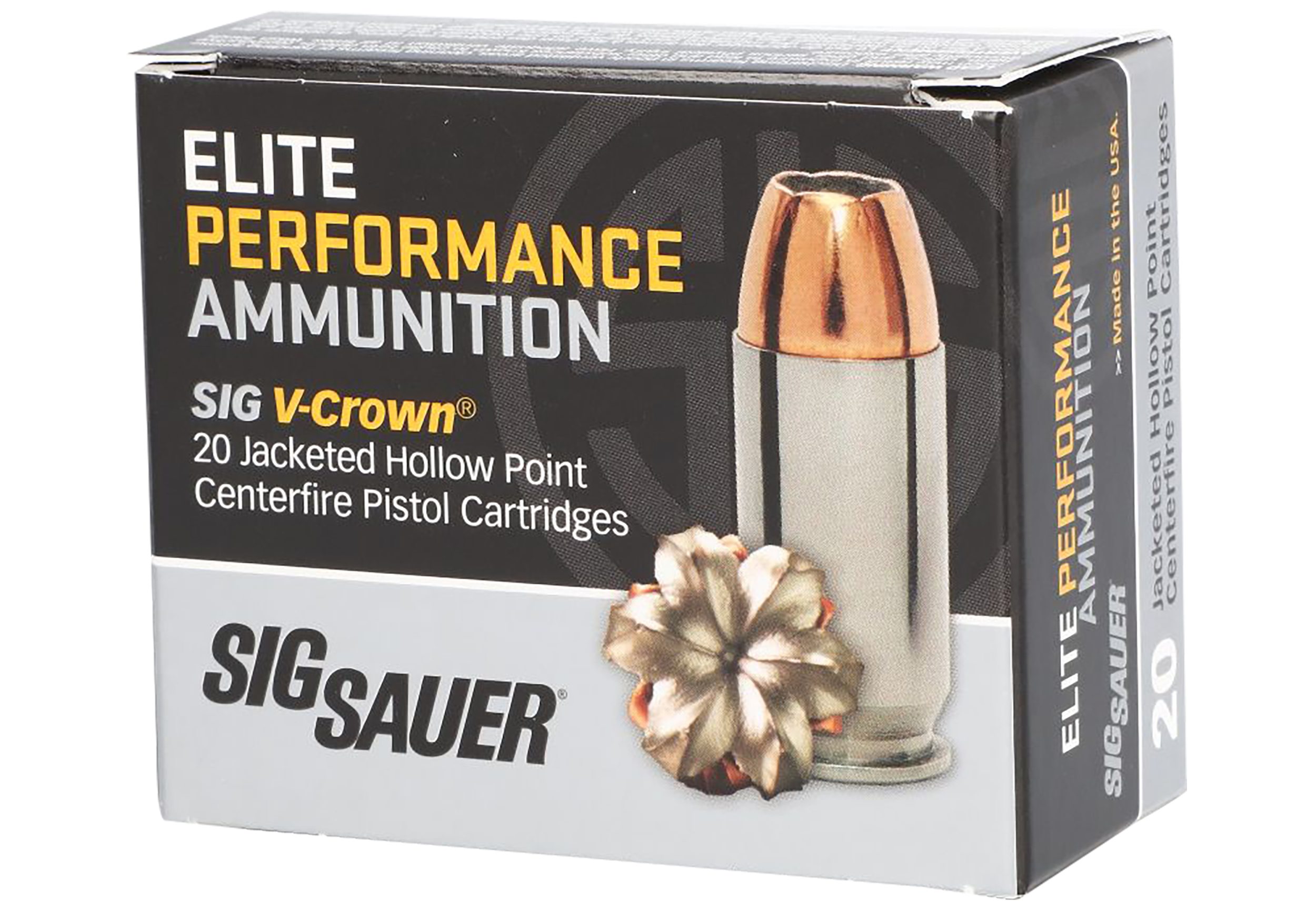 Sig's Elite Defense features a V-Shaped jacket with skives and scores to provide controlled, uniform expansion. A patented stacked hollow point bullet design features an additional hollow point cavity. Unique, toothed cannelure ensures maximum weight retention and terminal retention. Nickel-coated cases provide enhanced lubricity, superior corrosion resistance, and reliable feeding and extraction.