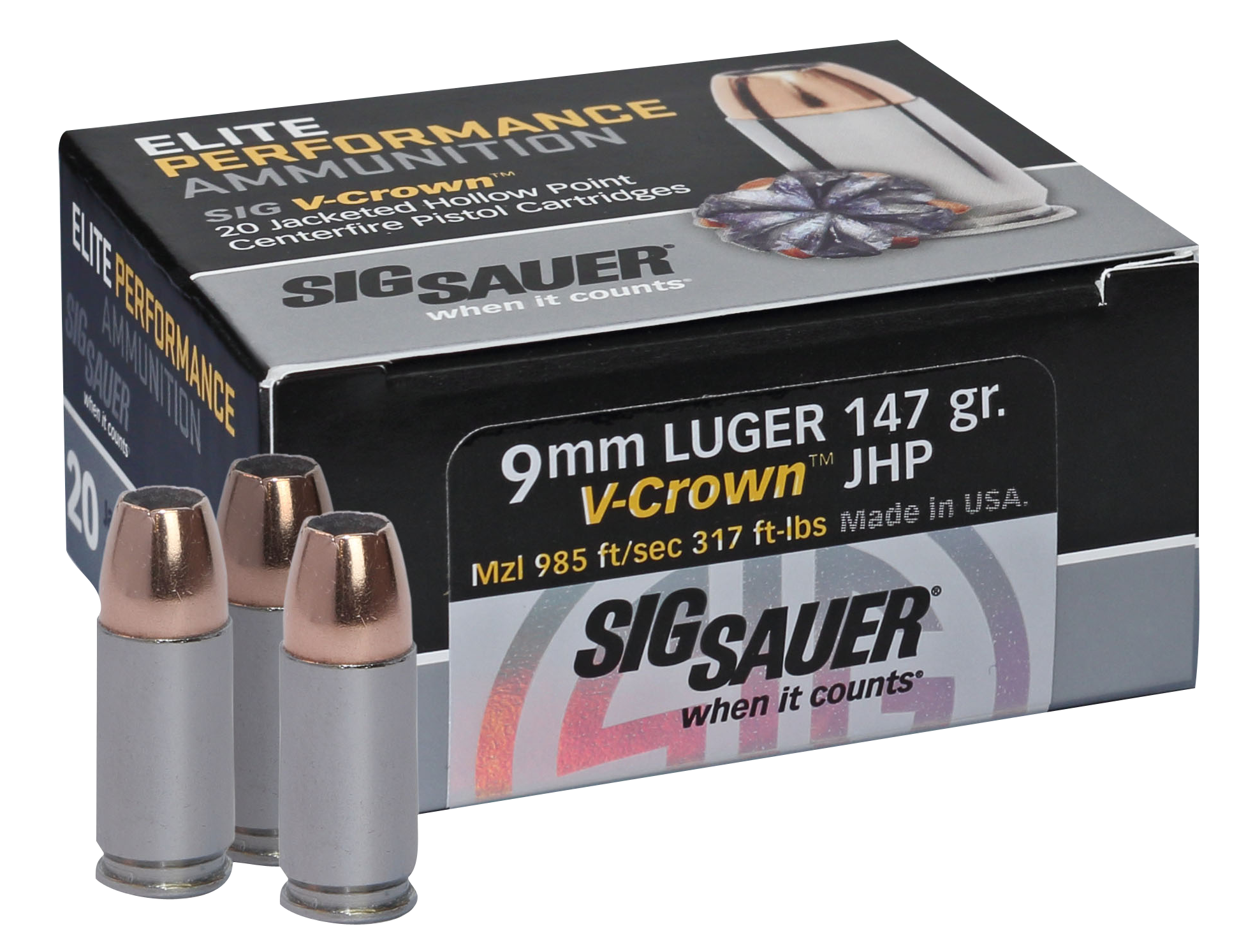 Sig's Elite Defense features a V-Shaped jacket with skives and scores to provide controlled, uniform expansion. A patented stacked hollow point bullet design features an additional hollow point cavity. Unique, toothed cannelure ensures maximum weight retention and terminal retention. Nickel-coated cases provide enhanced lubricity, superior corrosion resistance, and reliable feeding and extraction.