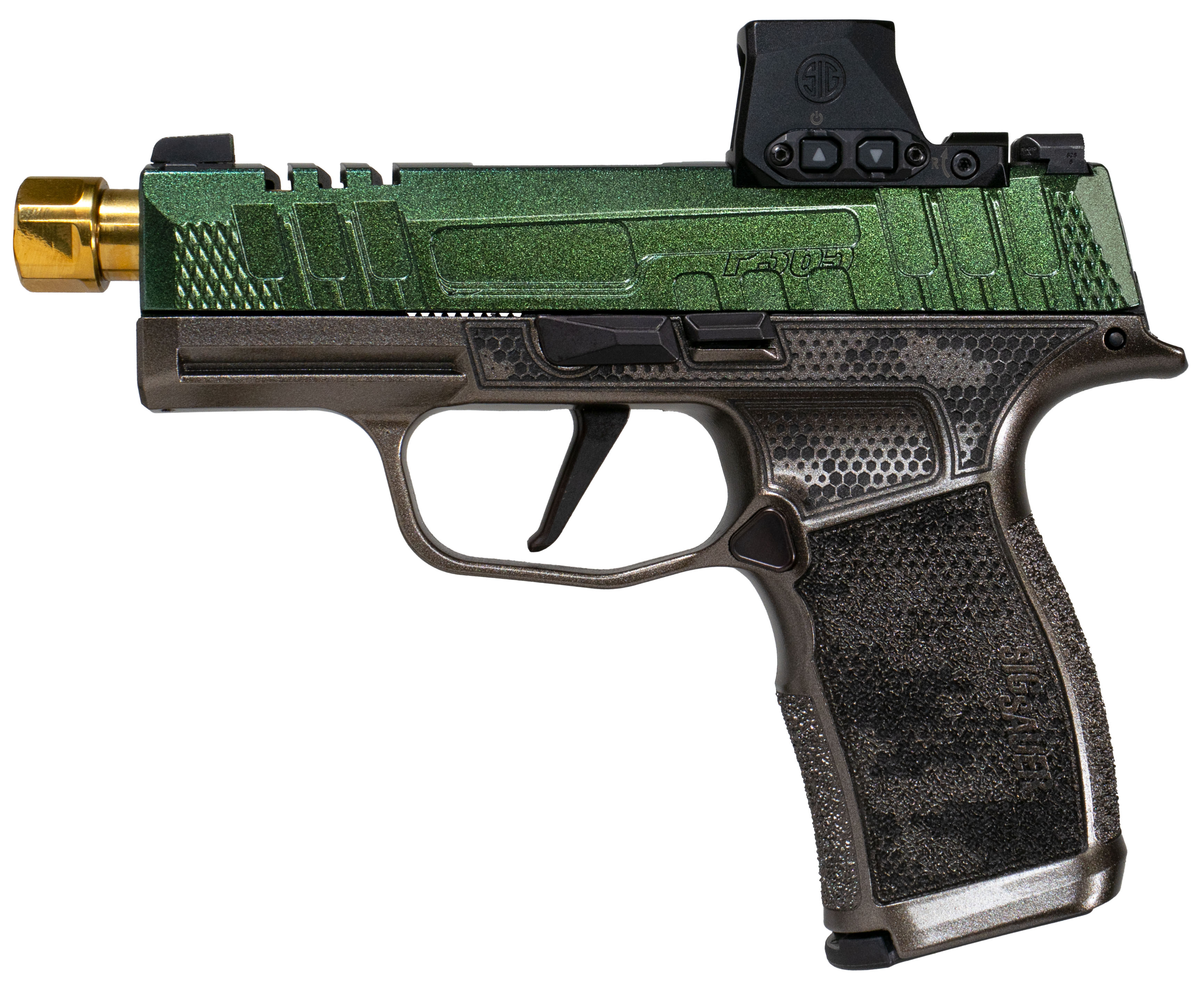 Introducing the Cypress Raptor for P365X by Shark Coast Tactical a stunning custom design that combines unique aesthetics with exceptional performance. This distinctive firearm features a Gun Candy Cerakote finish with a vibrant green slide and magazine baseplate that contrast beautifully with the flat dark earth (FDE) frame. This model also includes the new Romeo-X red dot adding a touch of precision to this carry model. Perfect for those who appreciate both form and function this custom piece is designed to turn heads while delivering the trusted performance you need in an everyday carry firearm.