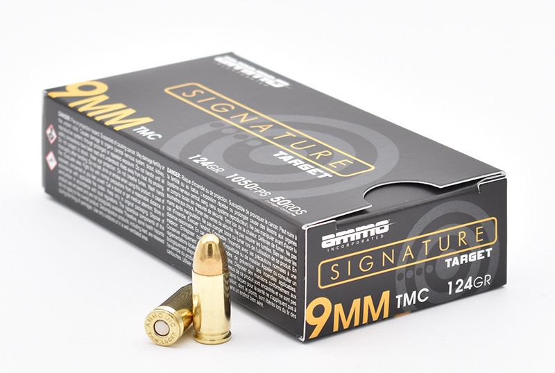 Ammo Incorporated, MFG# 9124TMC-A50, UPC: 818778022205, UOM: BOX, Signature Target 9MM , 124 grain, Total Metal Coating, Brass Case, 50/box, AMMI, AMMIAM40, AMMIAMALL, AM40, AMALL, Case: 20, DISC:MFG