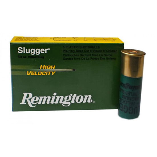 Remington's high-velocity Foster-style lead slug exits the barrel at 1800 fps which is 13 percent faster than standard 1 oz. slugs. The .875 oz. Slugger High Velocity delivers 200 ft-lbs more energy at 50 yards with flatter trajectory. This slug is designed for the avid deer hunter using smooth bore guns. - Gauge: 12 Gauge - Length: 3 - Weight: 7/8 oz - Shot Size: Slug - Muzzle Velocity: 1875 fps - Rounds Per Box: 5