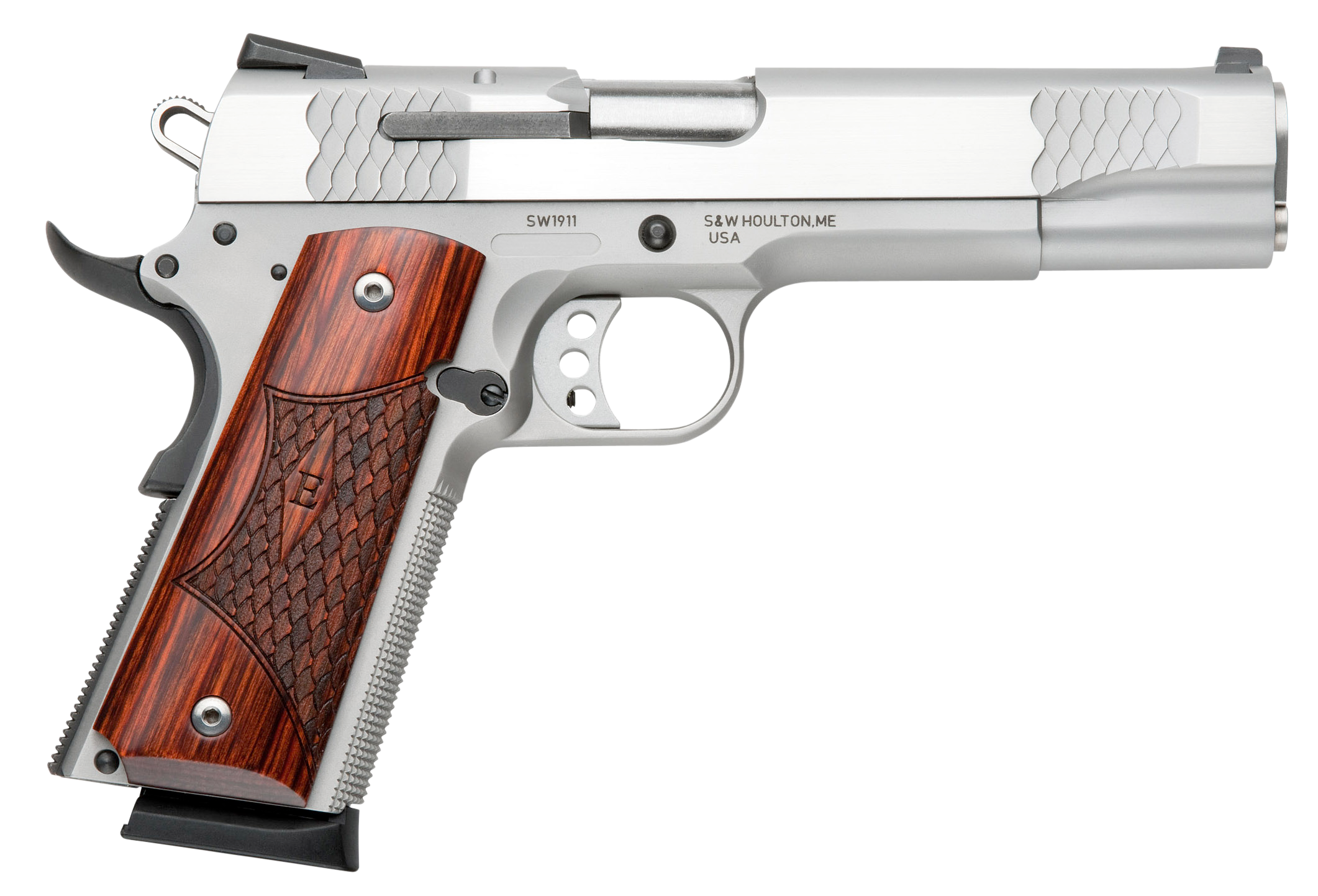 The Smith & Wesson 1911 Enhanced (E) Series single-action pistol features a 5 barrel low profile white dot sights wooden laminate E-Series grips and a stainless steel frame and slide. This E Series pistol features an enhanced oversized extractor enhanced combat ejection port enhanced titanium firing pin enhanced precision trigger and enhanced detailed slide rib.