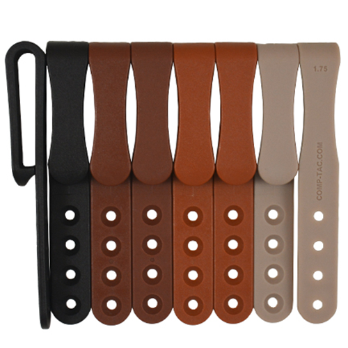 This is our most convenient clip. Simply slides over the belt and grips the bottom of the belt from the outside. The Standard Clip- 8 Pack comes with 8 clips. Two clips of each color in selected belt width (black, chestnut, khaki and brown). Comp-Tac Standard Clips are made of a durable yet flexible polymer plastic. The plastic is gentle on your belt, clothing and car seats yet strong enough to withstand over 10,000,000 flexes without failure. Features: Nylon Construction- Durable while Gentle on clothing car seats. 5 Holes Provide ride Height Adjustment to Holsters and Magazine Pouches. 5 Holes Provide Cant adjustment if using two clips to mount a holster or mag pouch. Holes are spaced 1/2 center to center. Clip is 5/8 wide at widest point. Package of 8.Standard Clips for IWB Holster (8 Pack) - 1.25