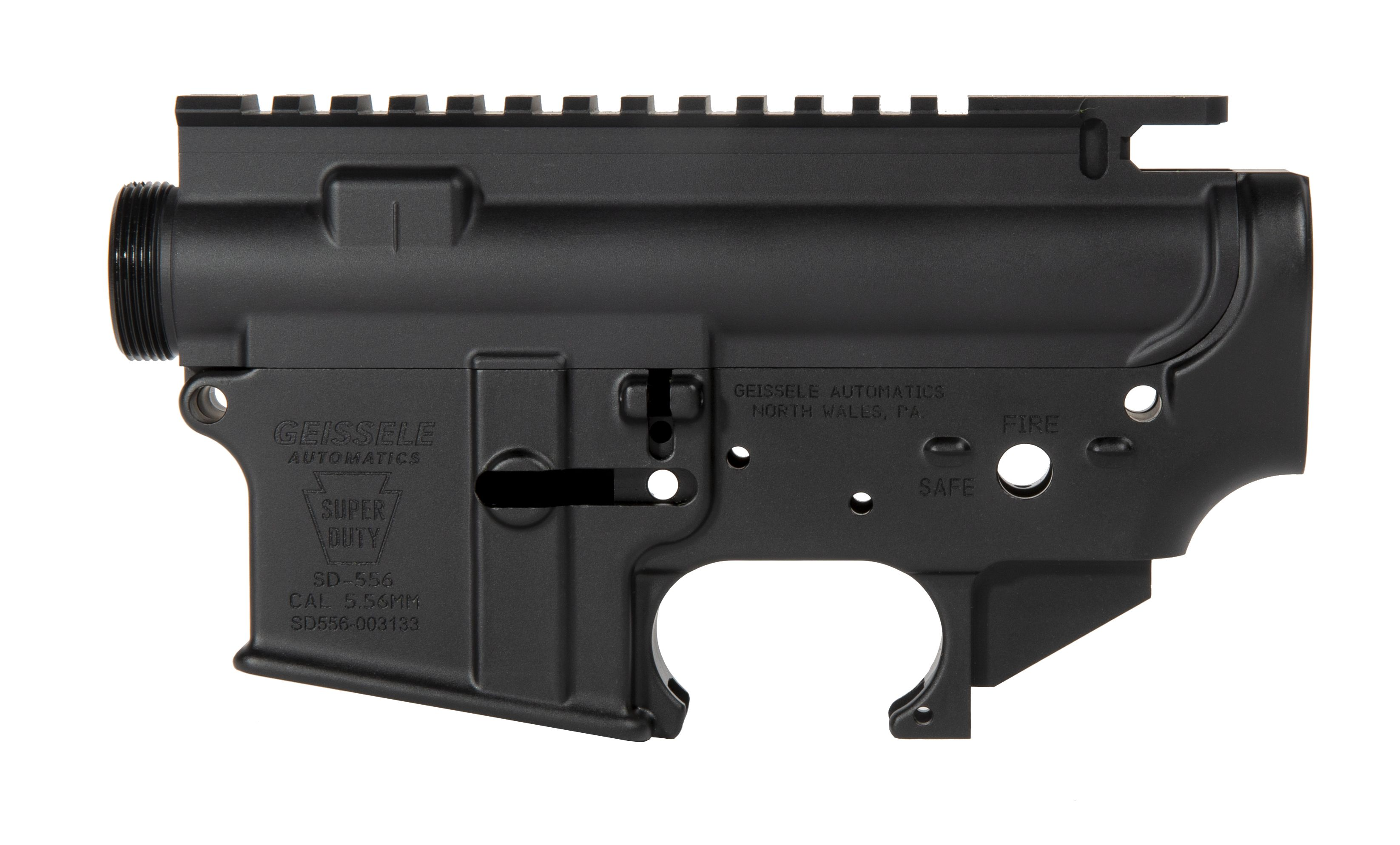 The Super Duty Receiver Set includes a Geissele Super Duty stripped lower and a Geissele Stripped Upper receiver. This high quality receiver set is precision machined from 7075-T6 aluminum forging and finished in durable Type 3 hardcoat anodize. With laser engraved T-marks and SAFE/FIRE markings, this mil-spec conforming Geissele Super Duty Receiver Set is the perfect start for your high-quality dream build.