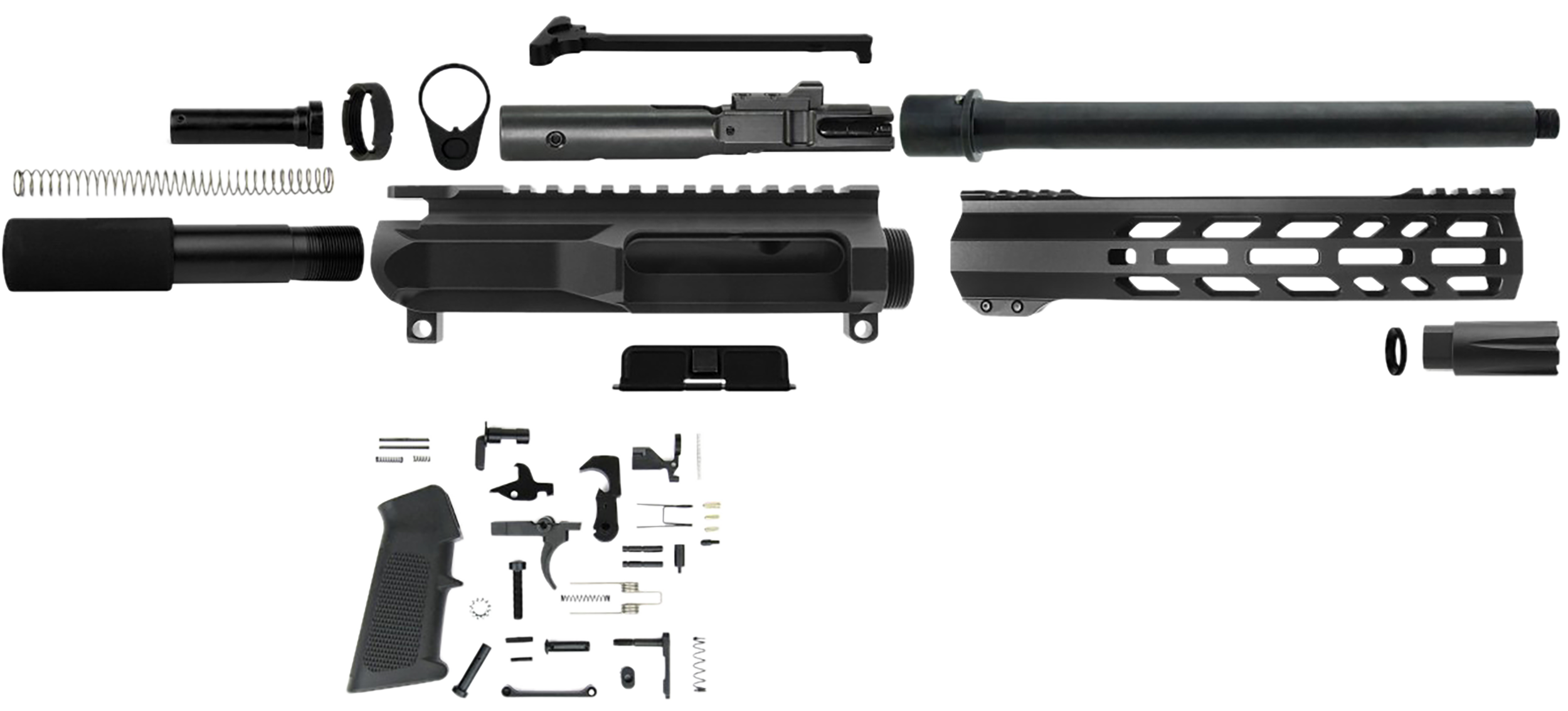 Includes: (1) .45ACP 10" Barrel USA Made (1) 45ACP Bolt Carrier Group (1) Slick side Upper Receiver USA Made (1) Slim Free Float MLOK Hand Guard 10" (1) Complete Lower Parts Kit USA Made (1) Standard Receiver End Plate (1) Mil-Spec/Commercial Castle Nut/Steel (1) Mil-Spec Pistol Buffer Tube/Alum. w/Foam Cover (1) Heavy Buffer (1) Buffer Tube Spring (1) Mil-Spec Charging Handle (1) Dust Cover (1) Forward Assist (1) 5/8x24 Linear Compensator