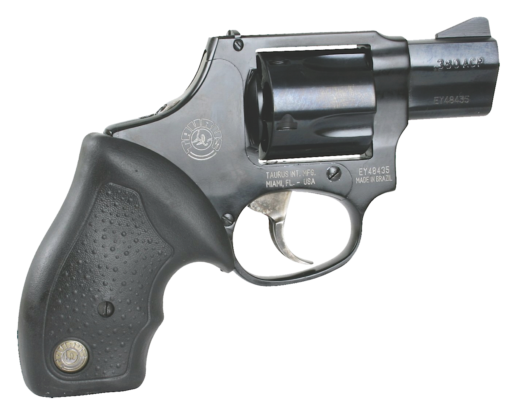 The Taurus Mini Revolver delivers Taurus' exclusive 5-shot cylinder, soft rubber grip and low profile sights. Its small size and lightweight frame makes it a perfect choice for law enforcement professionals or for concealed carry. This model has a blued frame, cylinder, barrel, and a black grip.
