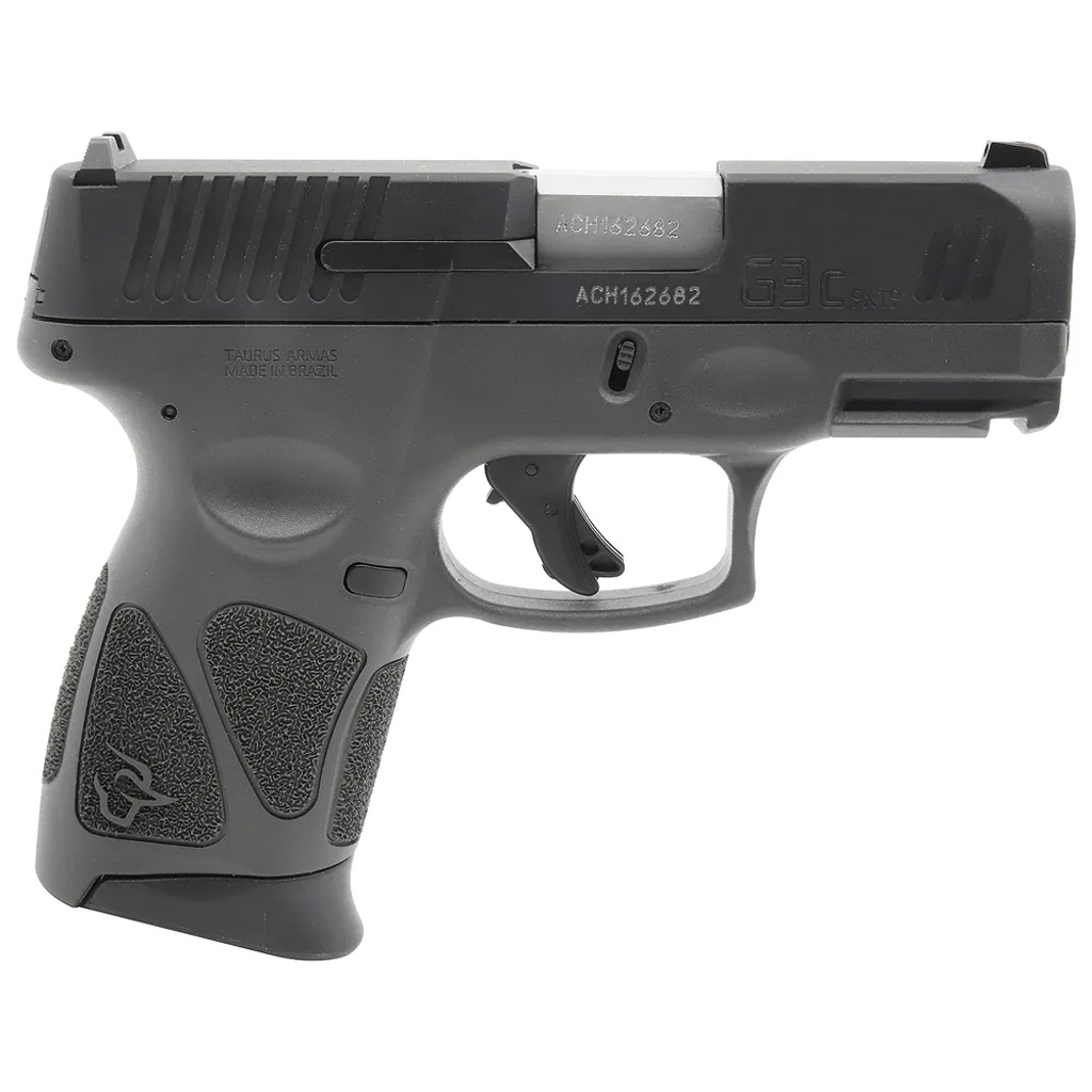 Taurus G3C Semi Auto Pistol in 9mm. 3.26 in. barrel with fixed front sight and drift adjustable rear sight. Striker fired action with manual safety. Gray polymer frame with Black slide. 12 round magazine.