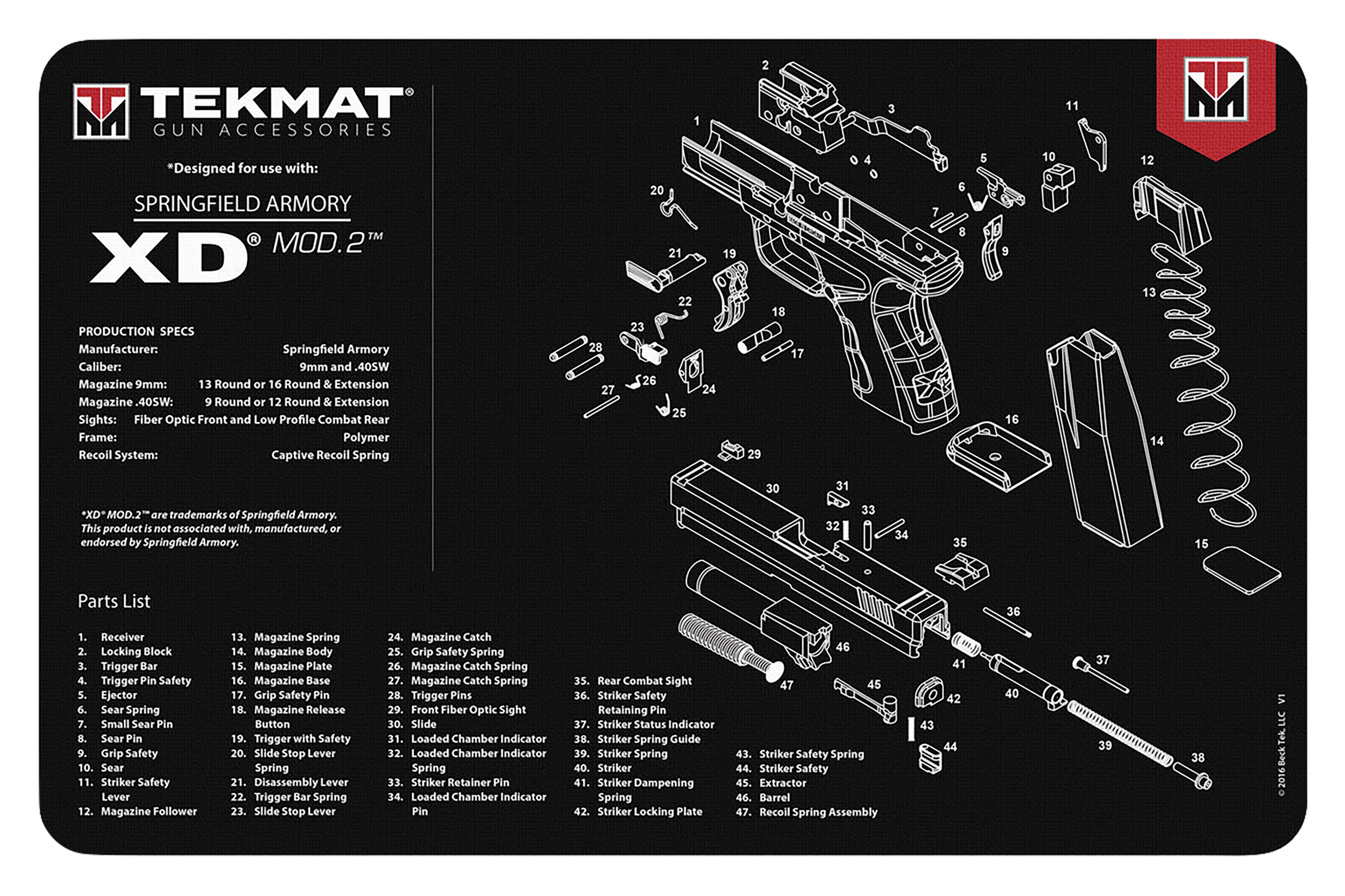 TekMat TEKR17XDMOD2 Springfield Armory XD MOD 2 Cleaning Mat Black/White Rubber 11"x17" Springfield Armory XD MOD 2 Parts Diagram