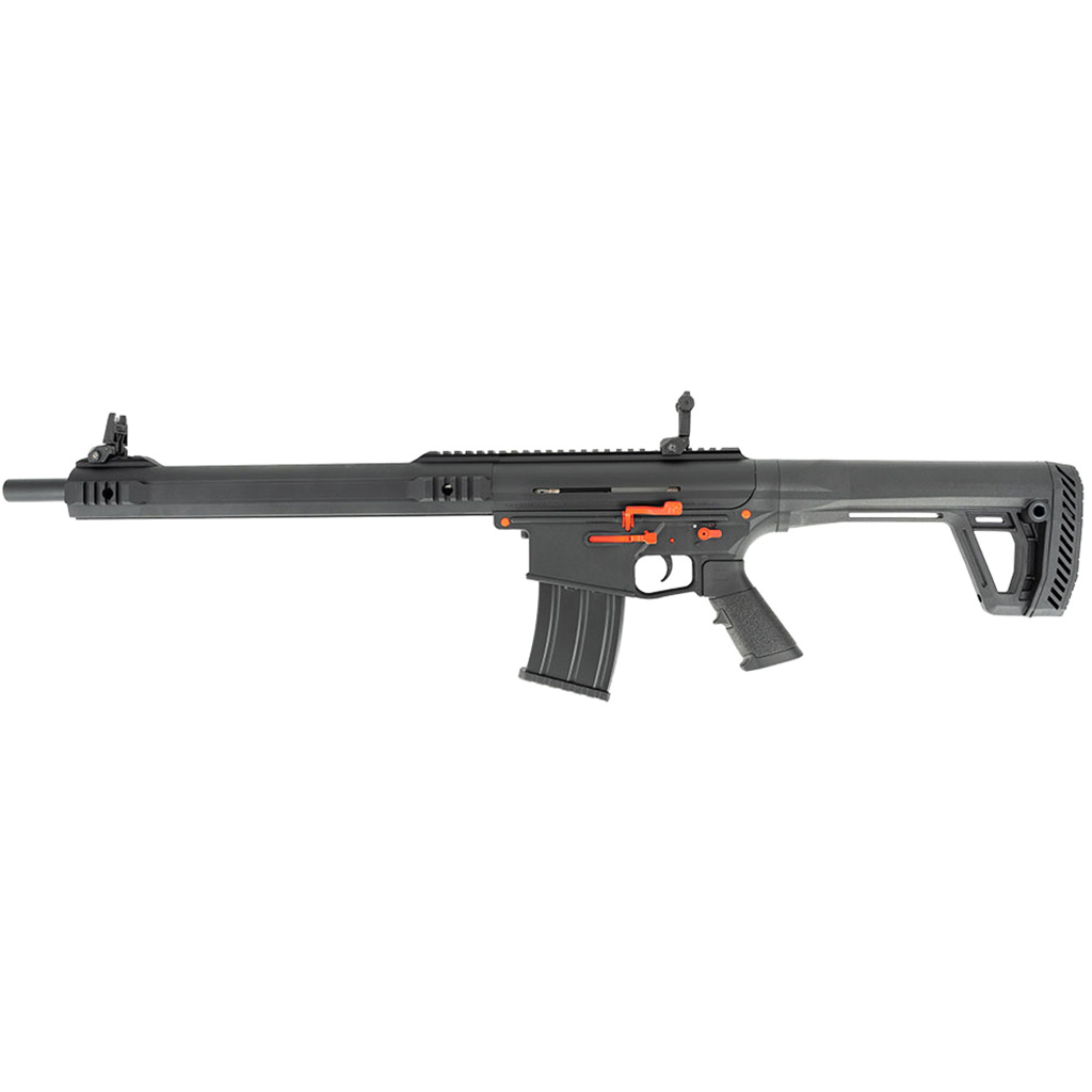 The MAC TT-12 Pro is a rugged, feature-rich 12-gauge semi-automatic shotgun designed for tactical operations, competitive shooting, and home defense. Built with AR/M4-style ergonomics, it features ambidextrous controls, a modular aluminum receiver, and compatibility with AR/M4 stocks and grips. The gas-regulated piston system ensures smooth cycling, while the 18.5-inch barrel is threaded for Benelli/Mobil chokes. With integrated M-LOK and Picatinny rails, the TT-12 Pro allows for full customization with lights, optics, and accessories. Finished in black with red accents and including flip-up sights, sling, and choke kit, this shotgun delivers modern performance with maximum adaptability.