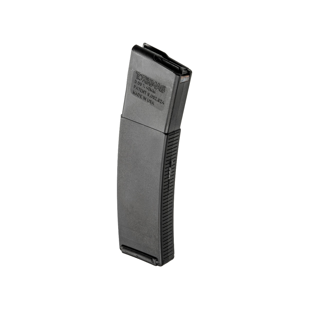 TorkMag s patented dual-spring system actively equalizes force on the nose and tail of loaded rounds, preventing the bolt-over-base and bullet nose diving malfunctions that have plagued large magazines. Because their workload is shared, both springs can be scaled down without sacrificing optimum resistance and reliability. The springs reduced footprint beneath the follower allows our design to be highly space efficient. No-slip grip pattern on the front and rear of the magazine. Lateral ribs alongside the baseplate for easy retrieval from a pouch under stress. Flat side walls for a minimal, narrow profile.