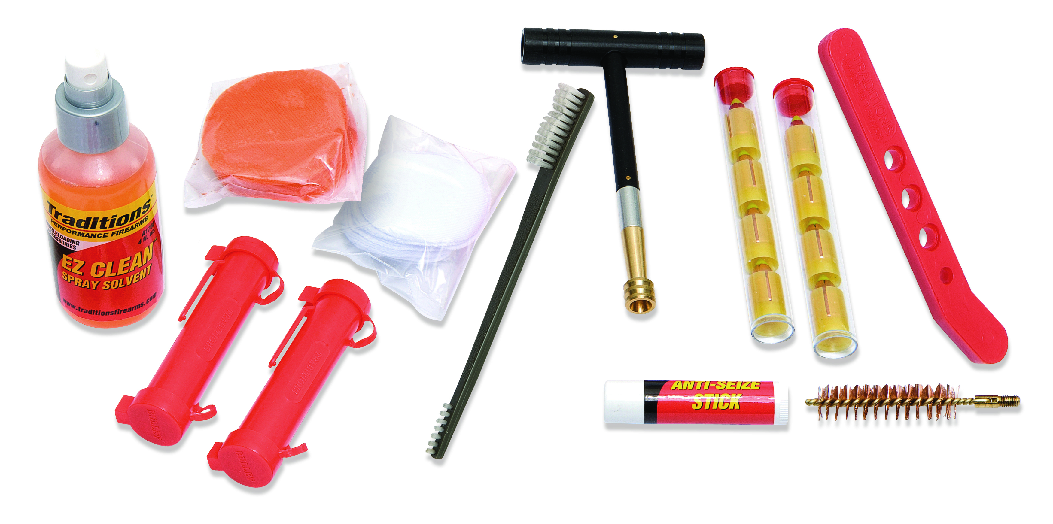 The Load It/Shoot It/Clean It Kit comes with everything you need! The kit includes: - Traditions DVD - EZ Clean Solvent - Bullet starter with jag - Loading and cleaning jag that doubles as a ramrod extension - 209/Musket capper - Bore brush - Magnum quick loaders - Breech plug grease - Cleaning patches (40 pcs) - Season patches (25 pcs) - Smackdown SST 250 grain bullets - EZ Load sabots - Ammo tubes with caps (2)