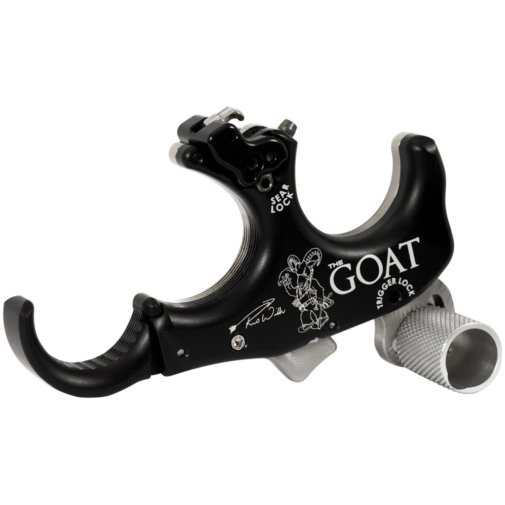 The Reo Wilde Signature Series GOAT combines two of the most popular methods of activation into one unprecedented release. The GOAT can be used as a thumb activated trigger release or hinge release in three easy steps, taking about 30 seconds to switch. The GOAT in the package is set as a thumb activated release, with individual trigger travel and trigger sensitivity screws with locks. Remove a single dowel, turn Sear Lock screw clockwise until tight and turn Trigger Lock screw clockwise until tight to make the GOAT a hinge style release. The GOAT as a hinge comes standard with a medium click installed and a no click option can be achieved by flipping the sear 180 degrees.