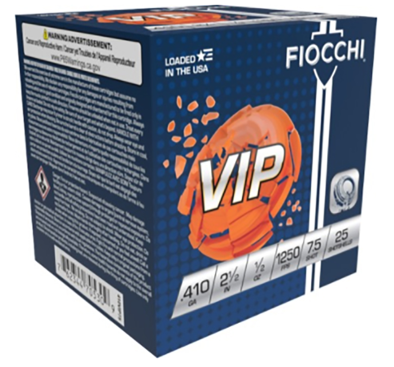 Fiocchi, MFG# 410VIP75, UPC: 762344852591, UOM: CS, VIP, 410ga, 2 1/2", 1/2oz, 1250FPS, #7.5 Target Load, FIOC, FIOCAM12, FIOCAMALL, AM12, AMALL, Case: 10