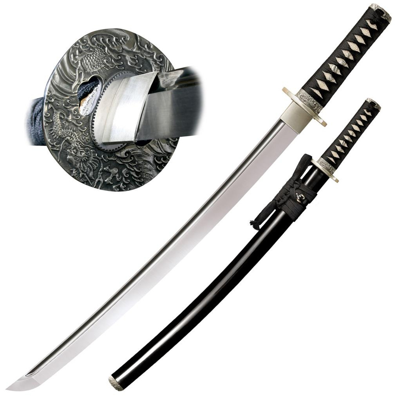 Cold Steels Emperor Wakizashi sword is styled to reflect some of the most distinctive hallmarks of Japanese sword design. We use only traditional materials for our Tsuba (guard), Fuchi (collar), and Kashira (pommel) - Each piece is expertly made and finely crafted in nickel-silver.The Habaki (blade collar) is also hand-made from nickel-silver and the hilt is covered in samé (ray skin) and tightly wrapped in the traditional style with black silk cord. A beautiful Menuki (a small, ornamental sculpture inserted between the ray skin and the cord wrappings) further enhances the handles appearance. All of our Emperor swords feature fully sharpened 1060 carbon steel blades that are heat treated to a tough spring temper. The blade is then carefully hand-finished with a beautiful mirror polish applied to the fuller.