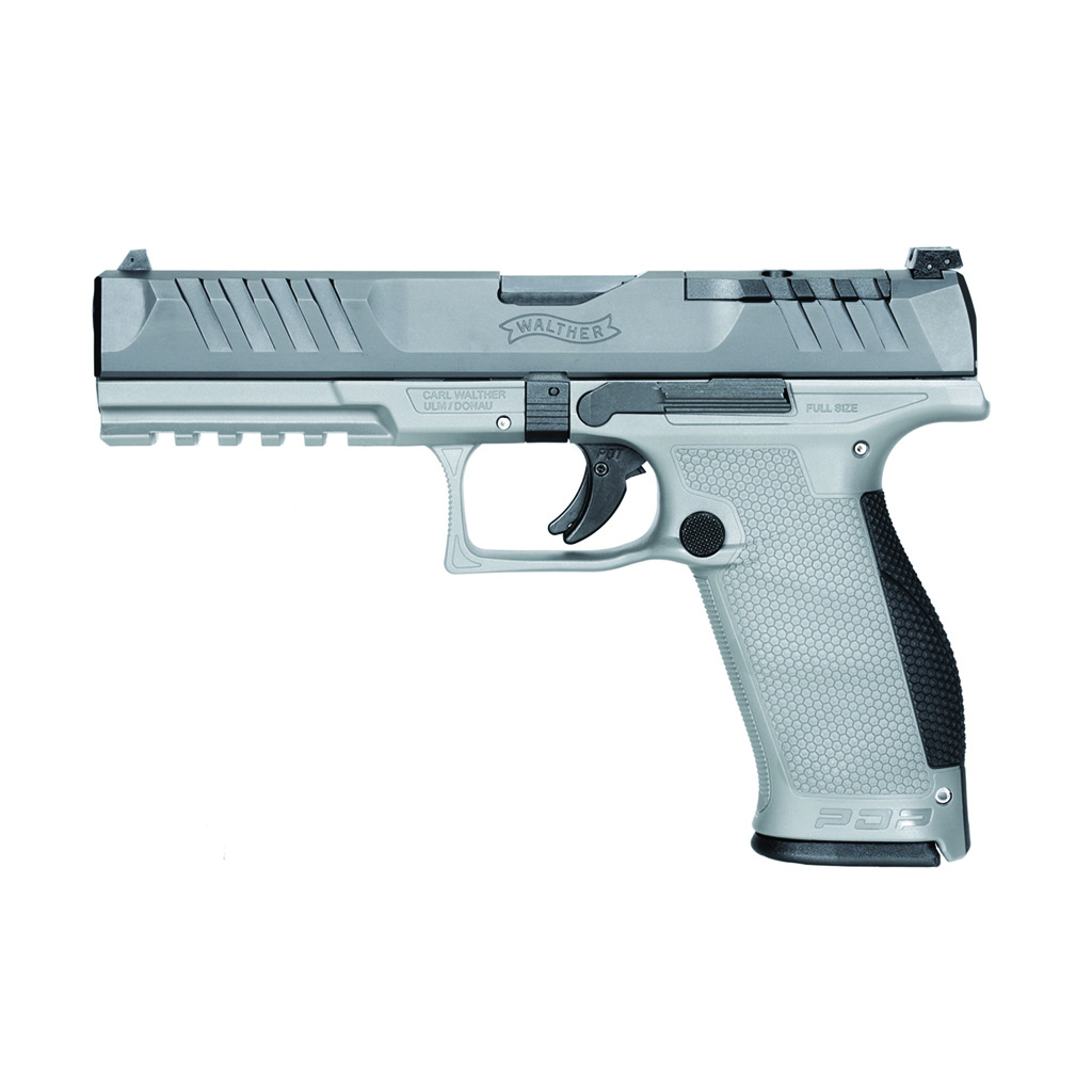 Walther PDP Full Size Optic Ready Semi-Auto Pistol 9mm. 5 in. barrel. Black Optics Ready slide and two-tone gray frame. Interchangeable backstraps. Picatinny rail. 2x18 rd. magazines.