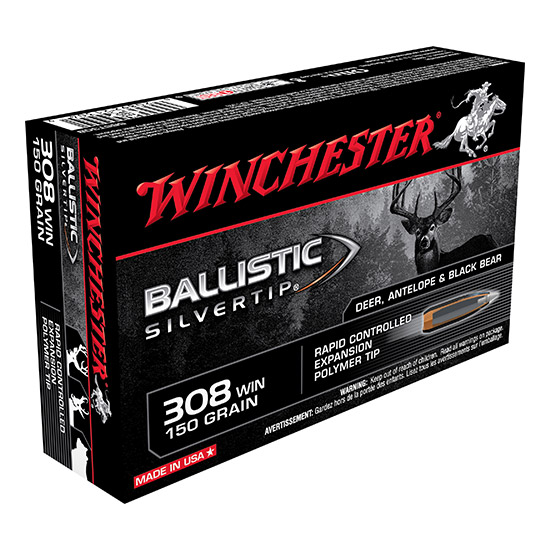 Ballistic Silvertip ammunition provides hunters proven immediate knock-down. Innovation combined with engineering excellence makes Ballistic Silvertip the choice for those who appreciate the legendary excellence Winchester is known for around the world. - Caliber: 308 Winchester - Bullet Type: Rapid Controlled Expansion Polymer Tip - Bullet Weight: 150 gr - Muzzle Energy: 2629 ft / lbs - Muzzle Velocity:Rounds Per Box: 20 - Rounds Per Case: 200