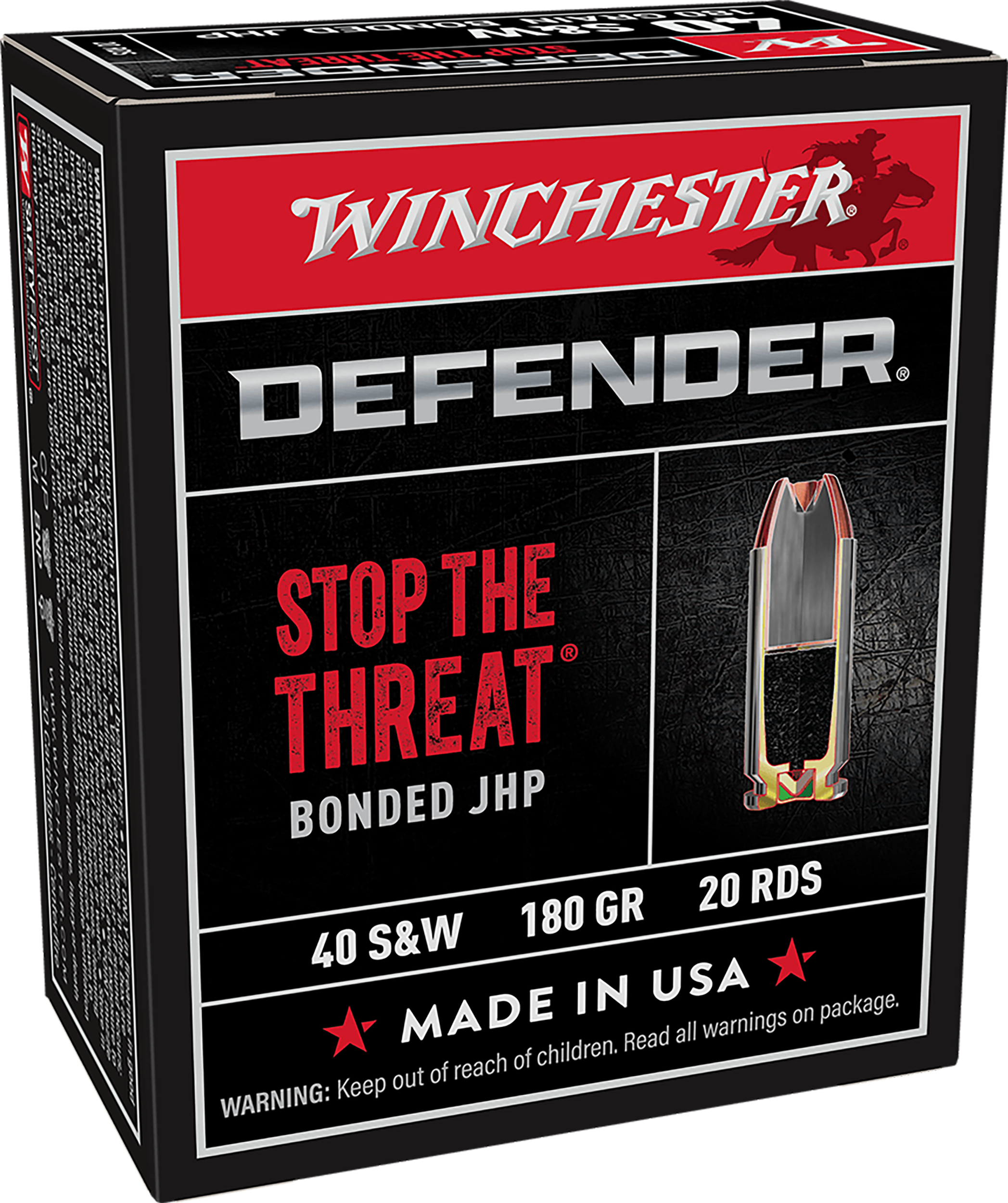 Engineered to maximize terminal ballistics as defined by FBI test protocol, Defender ammunition provides maximum stopping power for the ultimate in personal defense. Winchester's innovative bonding process welds the jacket to lead core for improved penetration, 1.5 x expansion and the proven performance you rely on when the stakes are high.