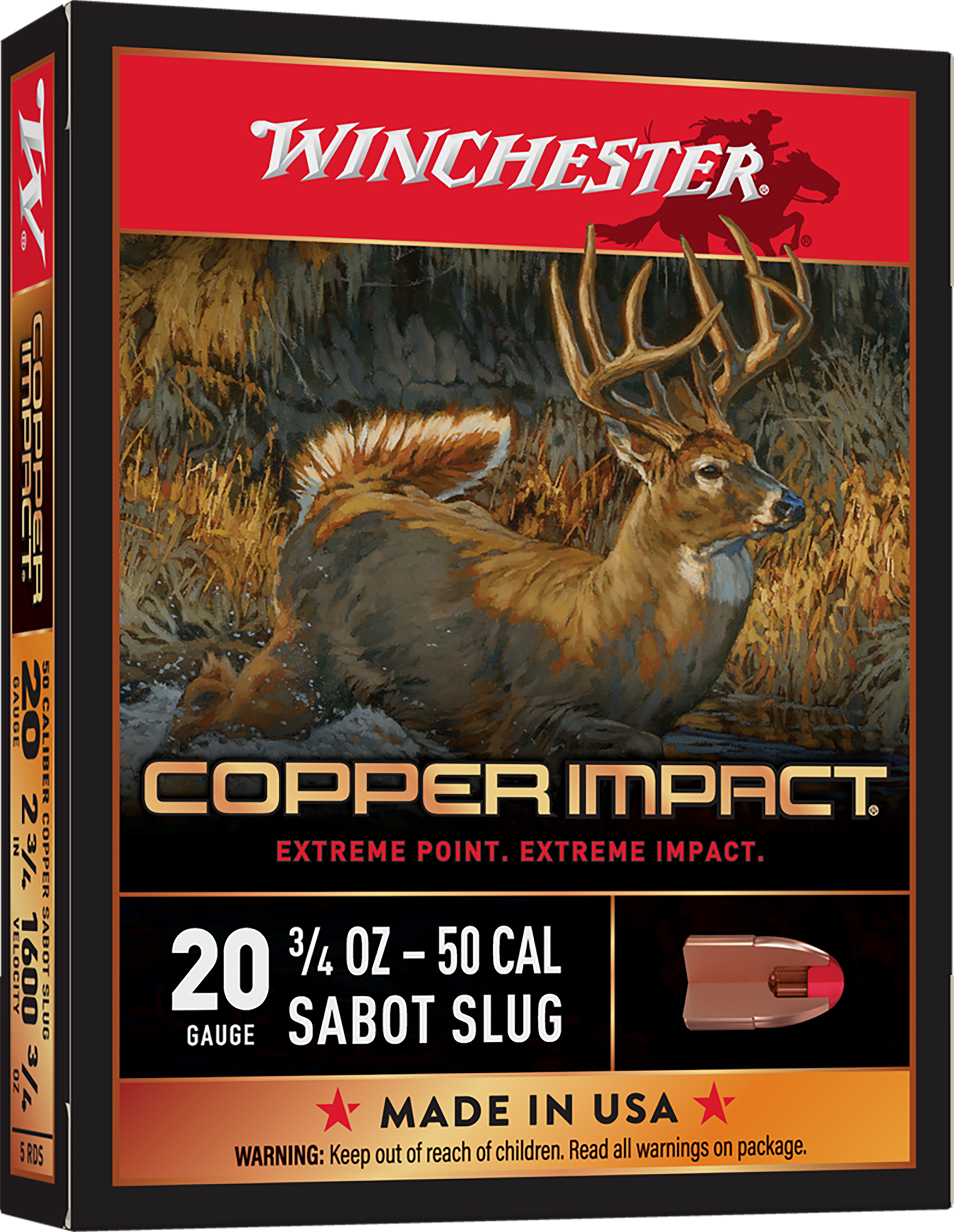 Winchester's Copper Impact features a large-impact-diameter Copper Extreme Point which expands immediately upon contact to deliver massive knockdown power. Its solid copper bullet design offers improved weight retention over standard jacketed lead-core bullets.