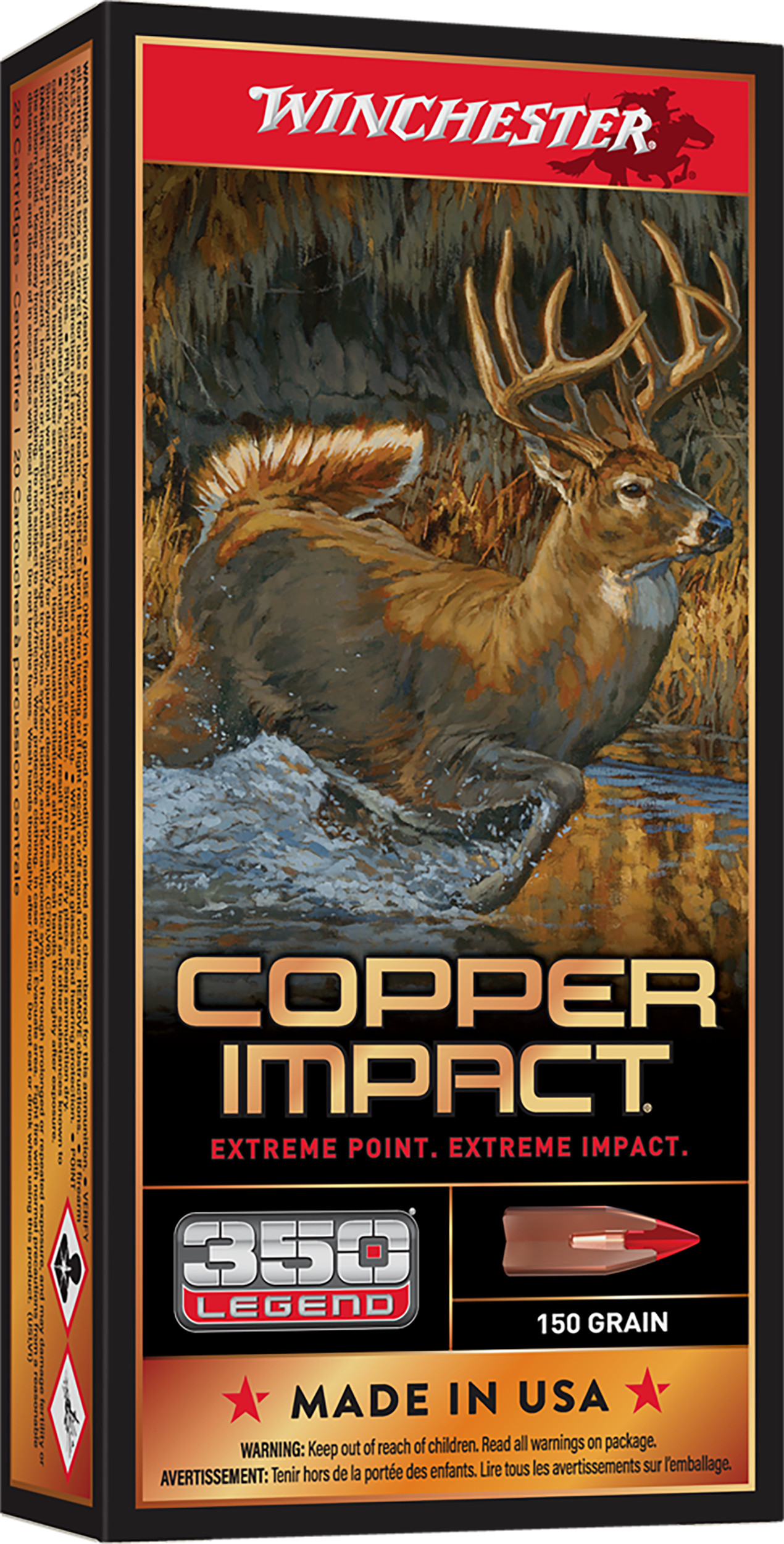Winchester's Copper Impact features a large-impact-diameter Copper Extreme Point which expands immediately upon contact to deliver massive knockdown power. Its solid copper bullet design offers improved weight retention over standard jacketed lead-core bullets.