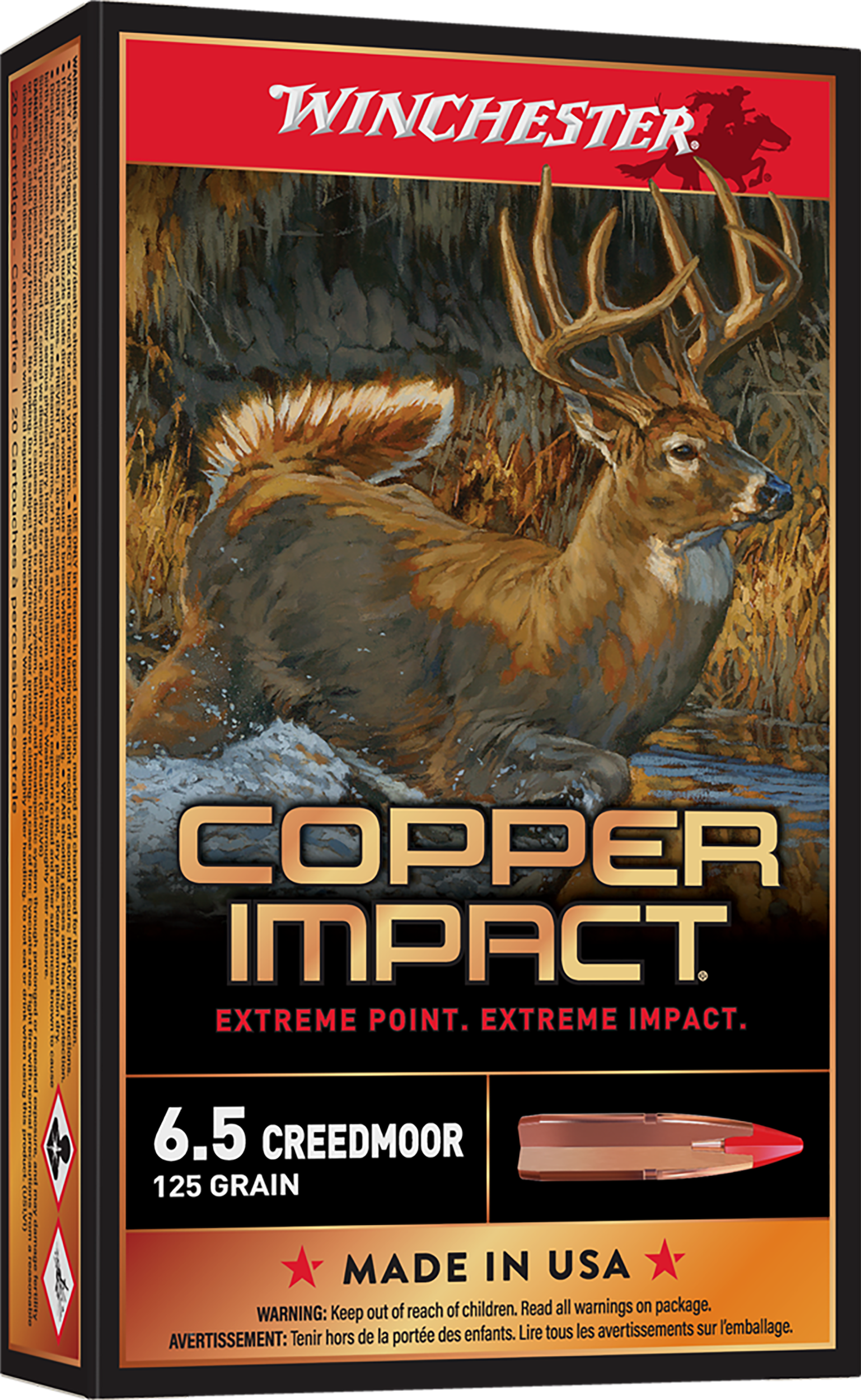 Winchester's Copper Impact features a large-impact-diameter Copper Extreme Point which expands immediately upon contact to deliver massive knockdown power. Its solid copper bullet design offers improved weight retention over standard jacketed lead-core bullets.