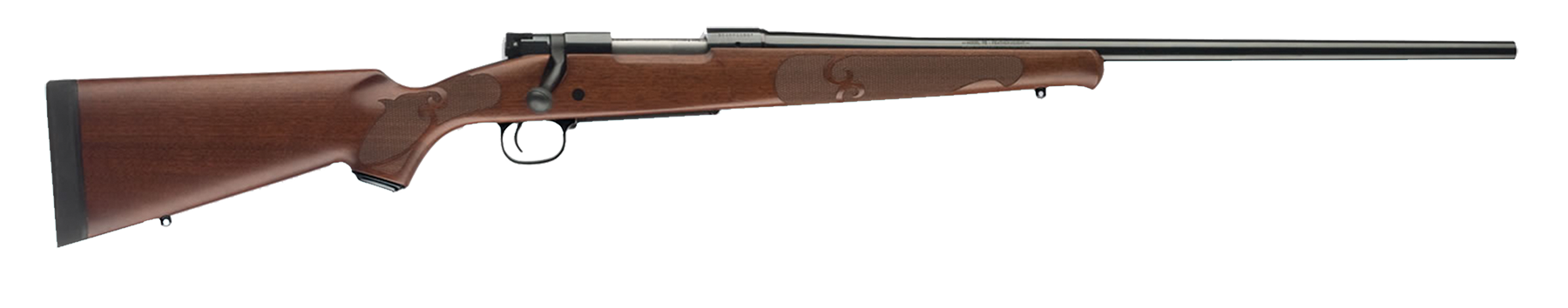 The Model 70 since 1936 it's been the benchmark against which every other bolt-action rifle is measured. It still has the famous 3-position safety which is convenient to operate with the thumb of your firing hand, lifting the firing pin away from the sear. The forged steel receiver starts from a solid block of steel. The bottom profile of this receiver is flat to offer greater surface area for bedding. It is bedded with a two-part epoxy in two places, at the front and rear to keep things from shifting around inside the stock during firing. The classic Controlled Round Feed (CRF) bolt design is a massive claw extractor that smoothly slips onto and secures about one-quarter of the base of the cartridge. This exerts full control over the cartridge from the time it leaves the magazine, as it enters the chamber, gripping tightly until the cartridge is fully ejected. This design also allows an unfired cartridge to be extracted even if it is not yet fully chambered. The M.O.A. Trigger System is the most precise three-lever trigger system in the world and an improved fit and finish and enhanced accuracy to go along with its classic Pre-'64 controlled round feeding. A blade-type ejector gives you full control when ejecting a fired case. Its free-floating barrel is button rifled in a process that assures superior accuracy and durability. This Featherweight model features a satin walnut stock with feather cut checkering and polished metal finish.