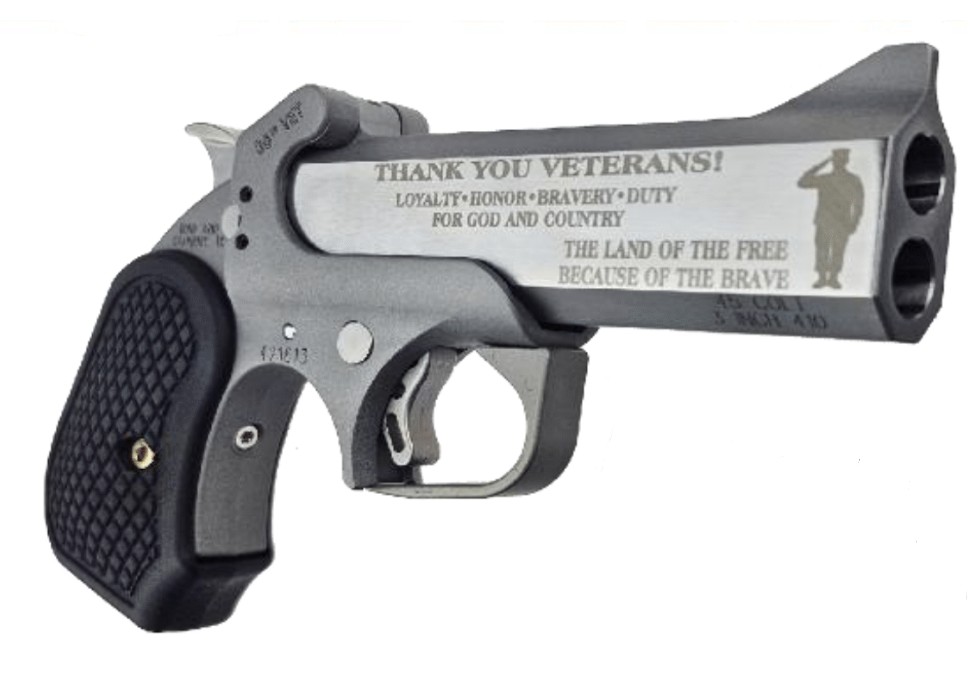 Bond Arms, MFG# BA30thVET - 45LC/410, UPC: 855959008511, UOM: EA, XLV 30th VET, .45 Colt/.410, 4.25" Barrel, Engraved Stainless, Black, 2-rd, BOND, BONDHG25, BONDHGALL, HG25, HGALL