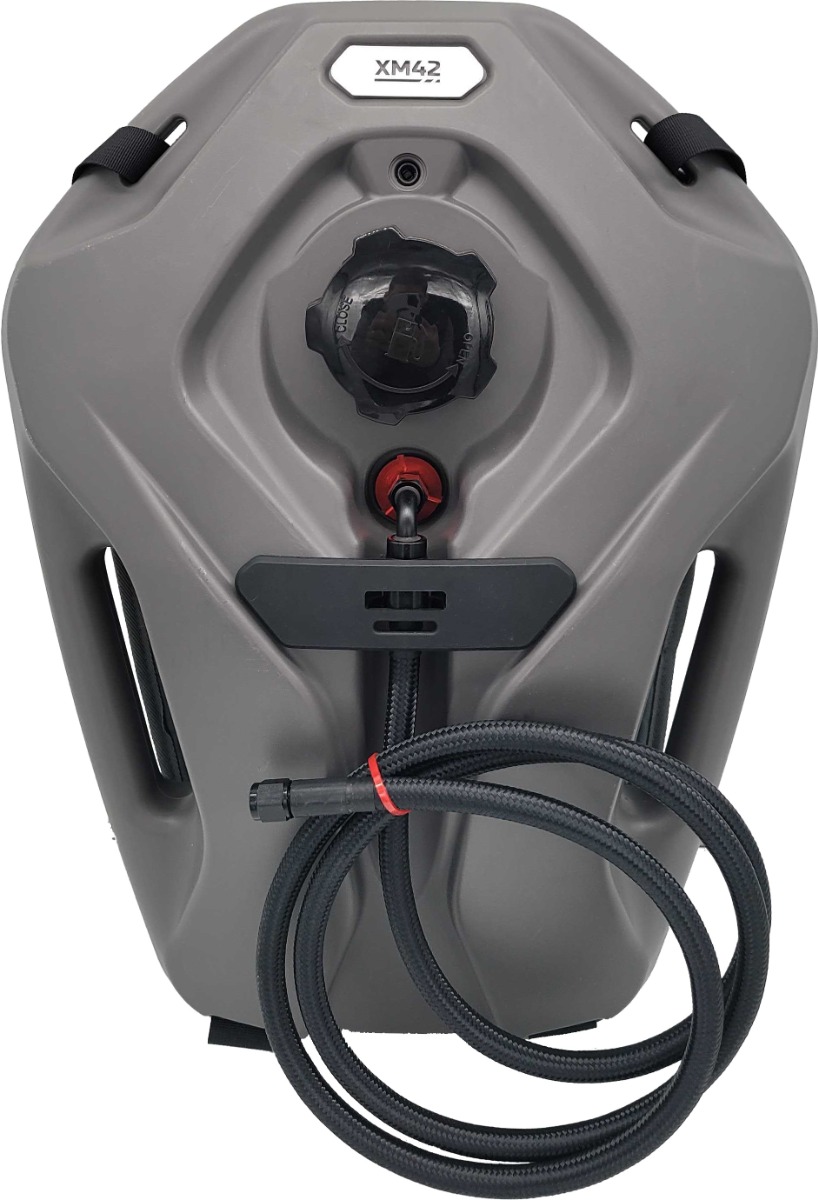 The XM42 Polymer Backpack Tank is designed for extended use, offering a lightweight and durable fuel solution for your XM42 flamethrower. Featuring a 2.5-gallon capacity, this tank allows for longer operation without frequent refueling. Its polymer body ensures durability while keeping weight to a minimum. The black braided hose provides a secure and flexible fuel transfer system, ensuring reliable performance. For added comfort, the backpack includes padded, adjustable straps, making it easy to carry and use for extended periods. Upgrade your XM42 with this high-capacity, ergonomic fuel system.